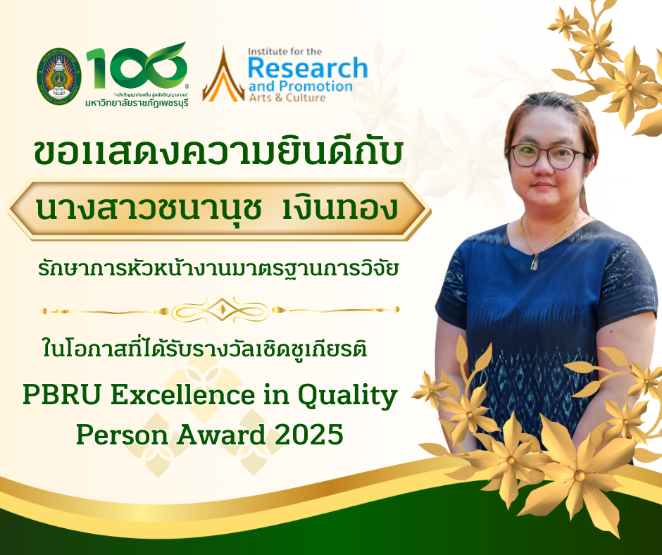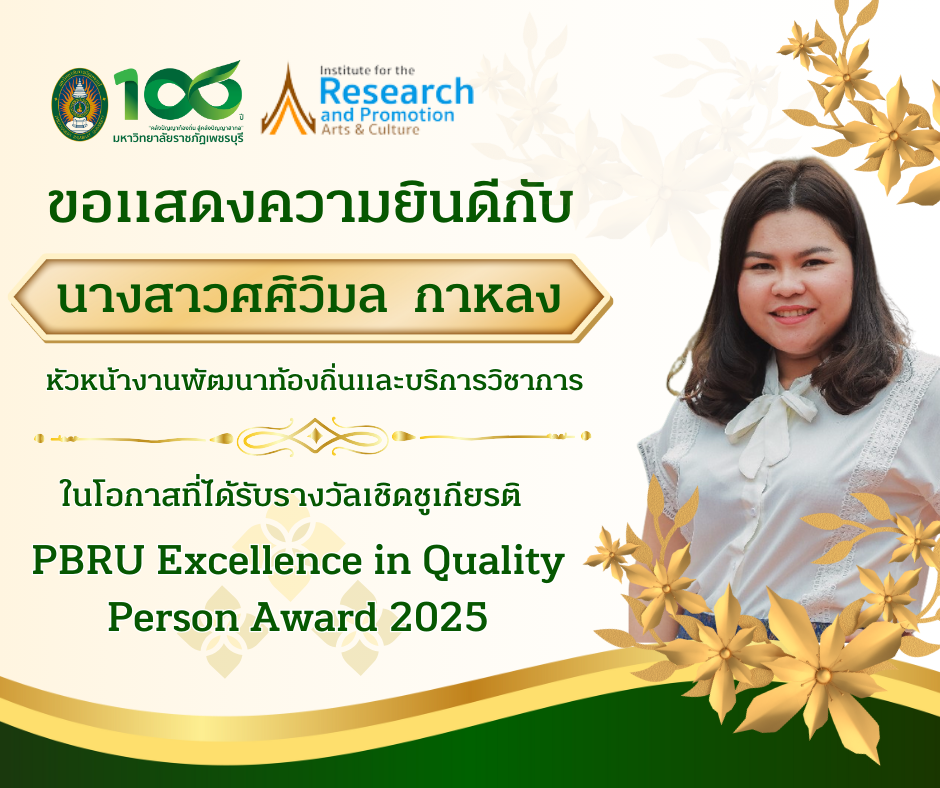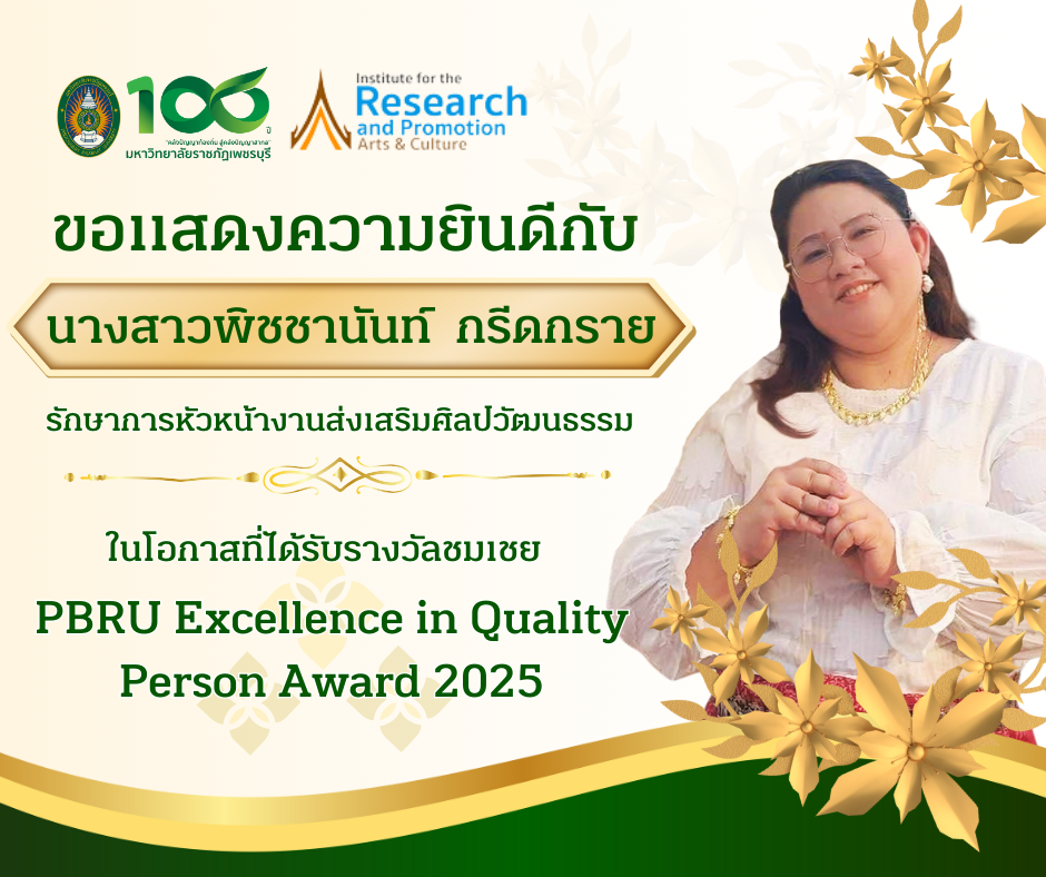 สถาบันวิจัยและส่งเสริมศิลปวัฒนธรรม ขอแสดงความยินดีกับบุคลากรของสถาบันวิจัยฯ ในโอกาสที่ได้รับรางวัลเชิดชูเกียรติ PBRU Excellent in Quality Person Award แห่งปี 2025 ในโครงการมอบรางวัลเชิดชูเกียรติ PBRU Excellent in Quality Person Award แห่งปี 2025 ที่จัดขึ้นโดยมหาวิทยาลัยราชภัฏเพชรบุรี ดังรายนามต่อไปนี้