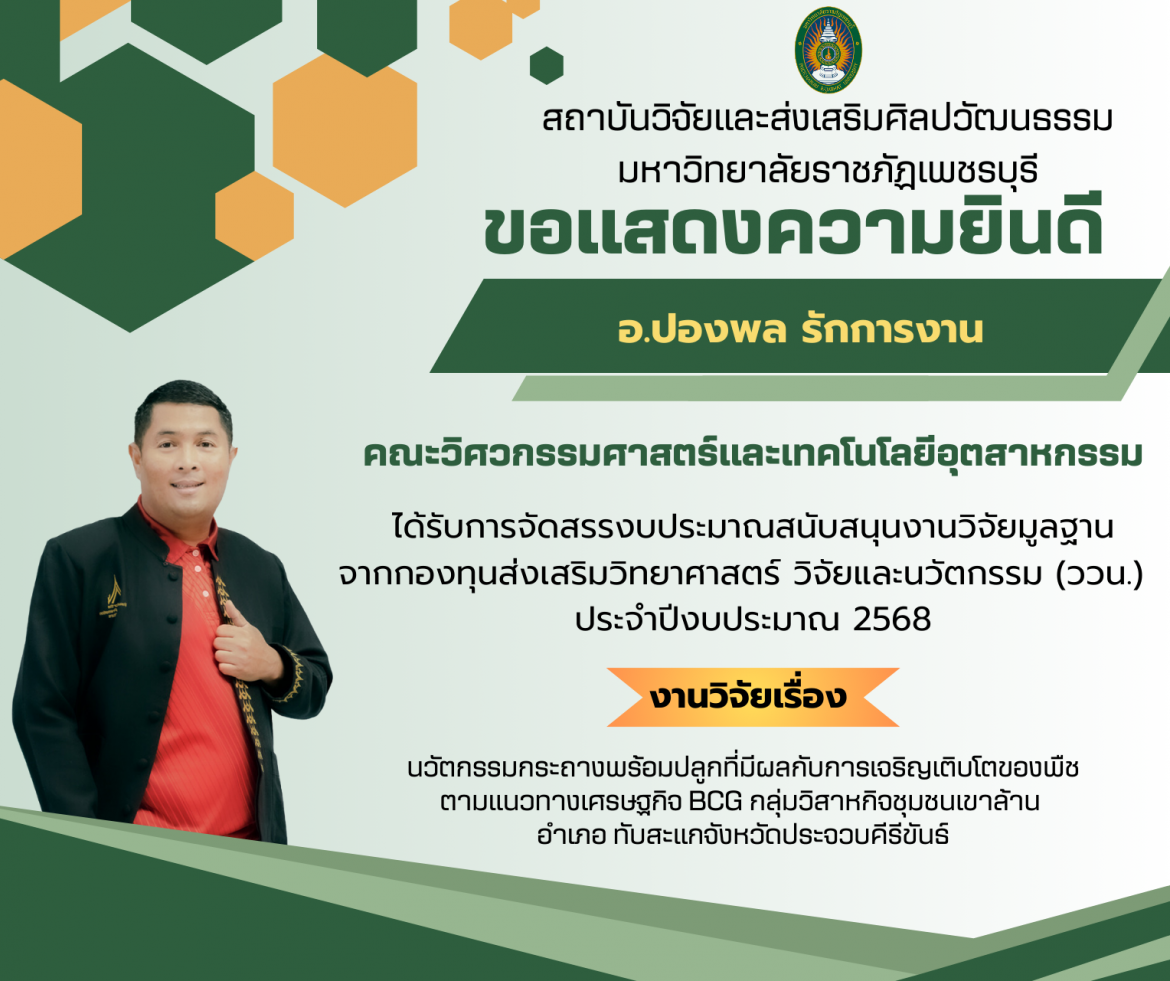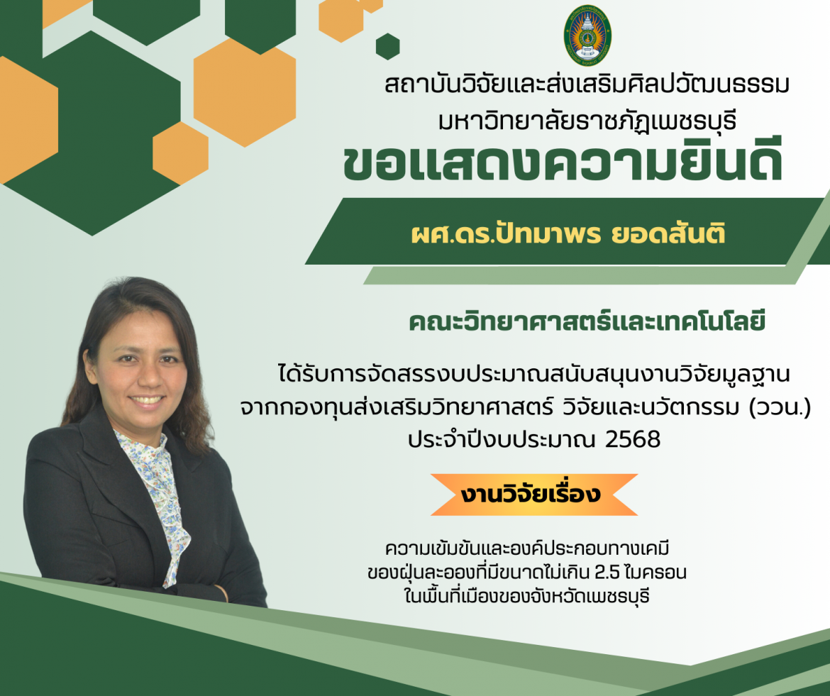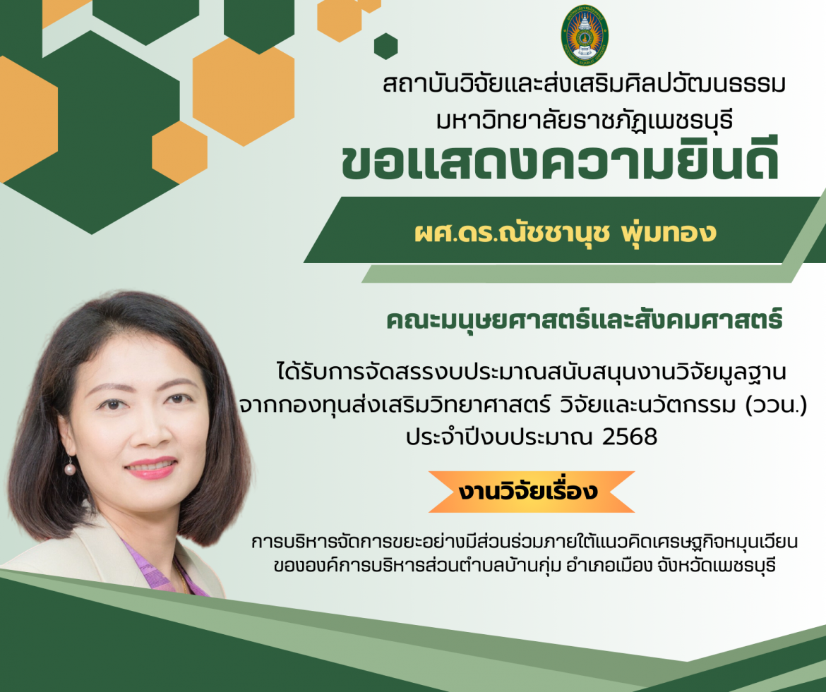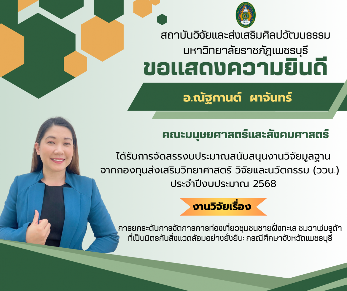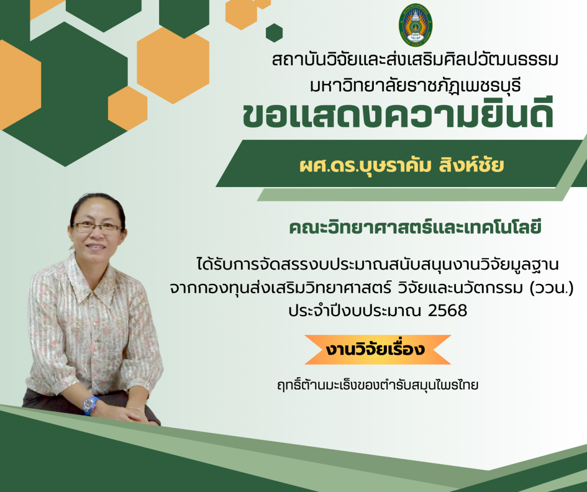 ทั้งนี้ มหาวิทยาลัยราชภัฏเพชรบุรี ได้ส่งเสริมและสนับสนุนให้นักวิจัยที่ได้รับงบประมาณทุนสนับสนุนงานมูลฐานของหน่วยงาน (Fundamental Fund: FF) เข้าร่วมนำเสนอผลการดำเนินงาน จำนวน 4 โครงการ ประกอบด้วย