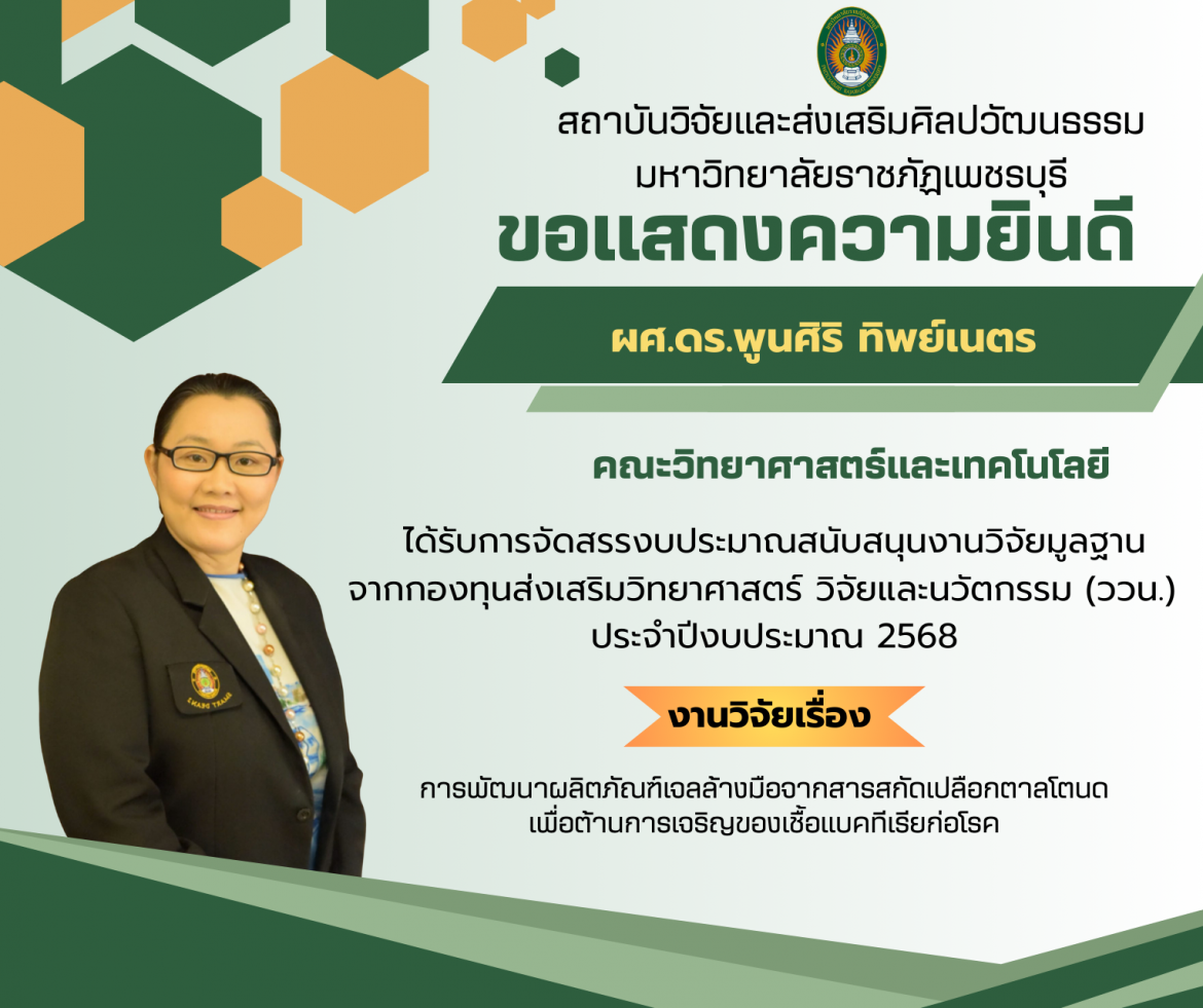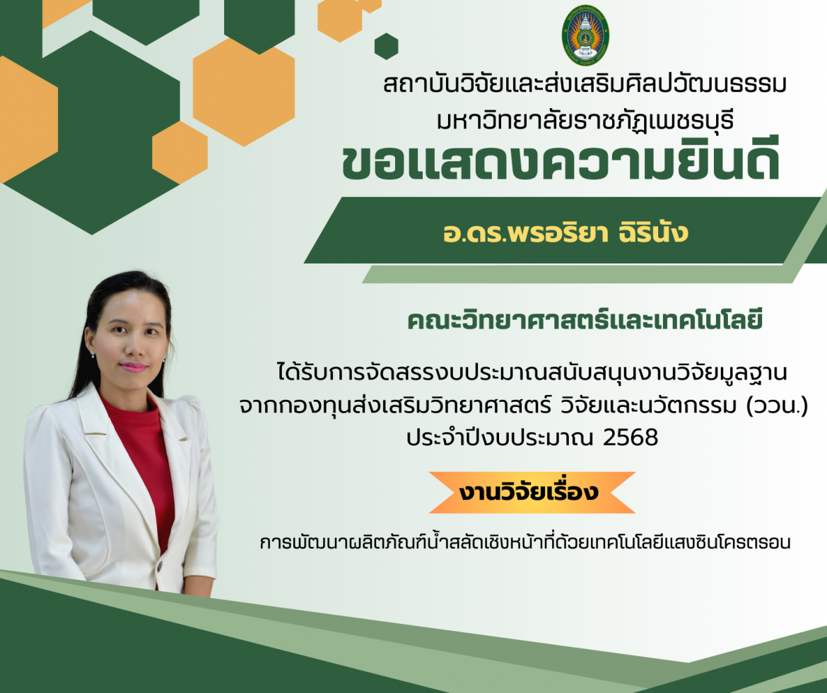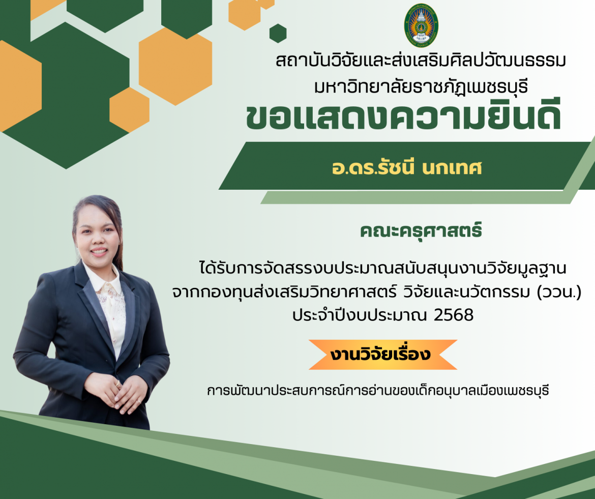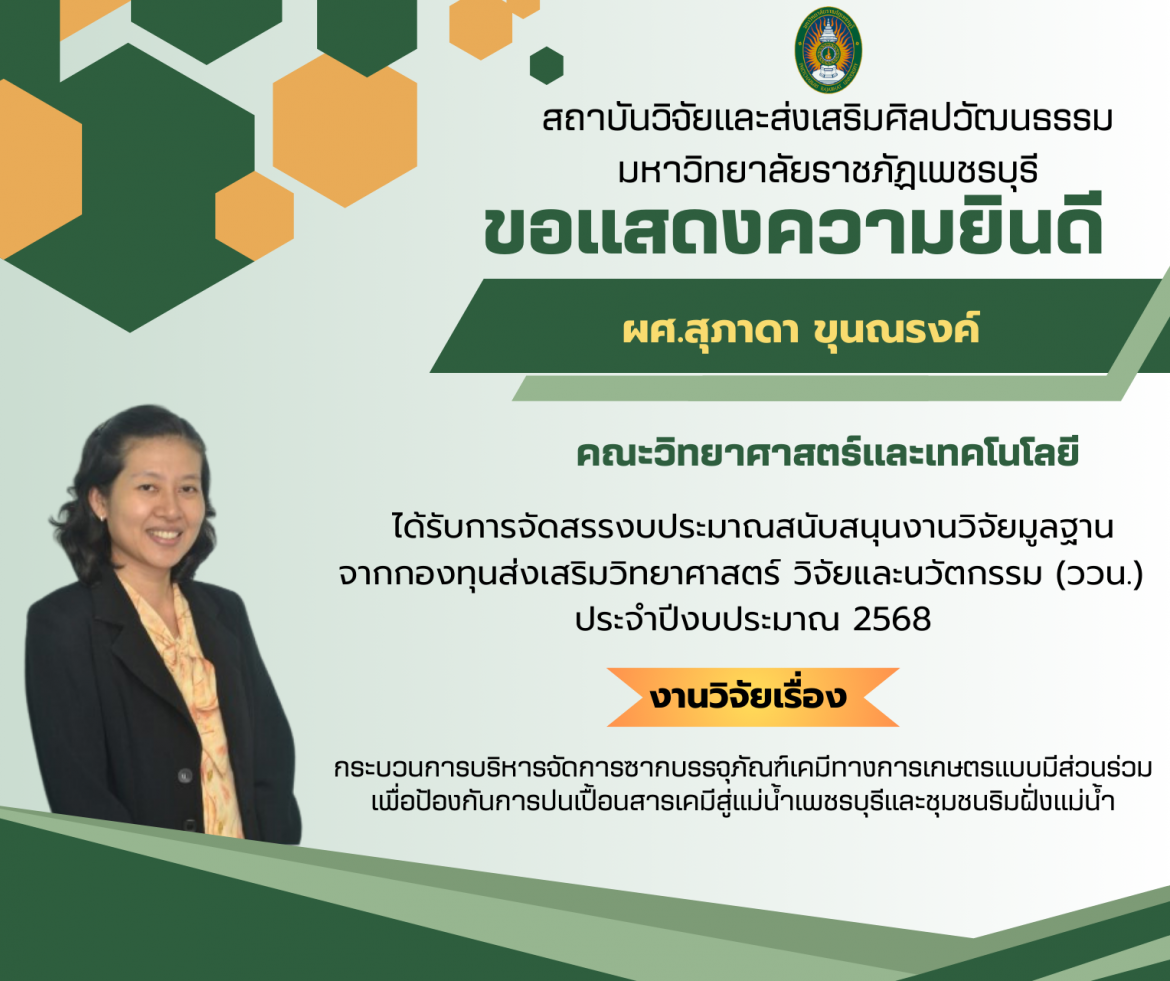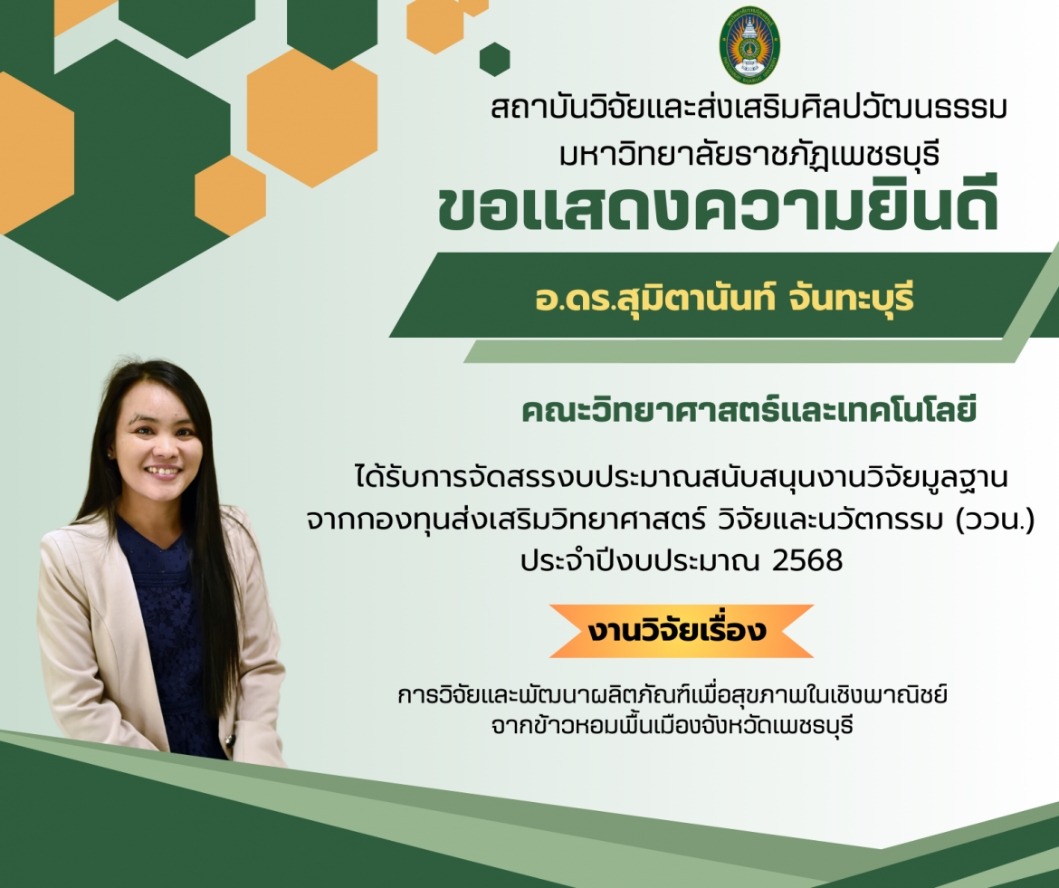 ทั้งนี้ มหาวิทยาลัยราชภัฏเพชรบุรี ได้ส่งเสริมและสนับสนุนให้นักวิจัยที่ได้รับงบประมาณทุนสนับสนุนงานมูลฐานของหน่วยงาน (Fundamental Fund: FF) เข้าร่วมนำเสนอผลการดำเนินงาน จำนวน 4 โครงการ ประกอบด้วย