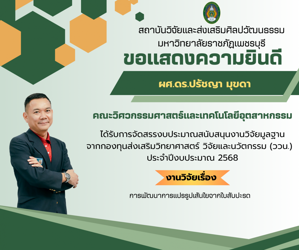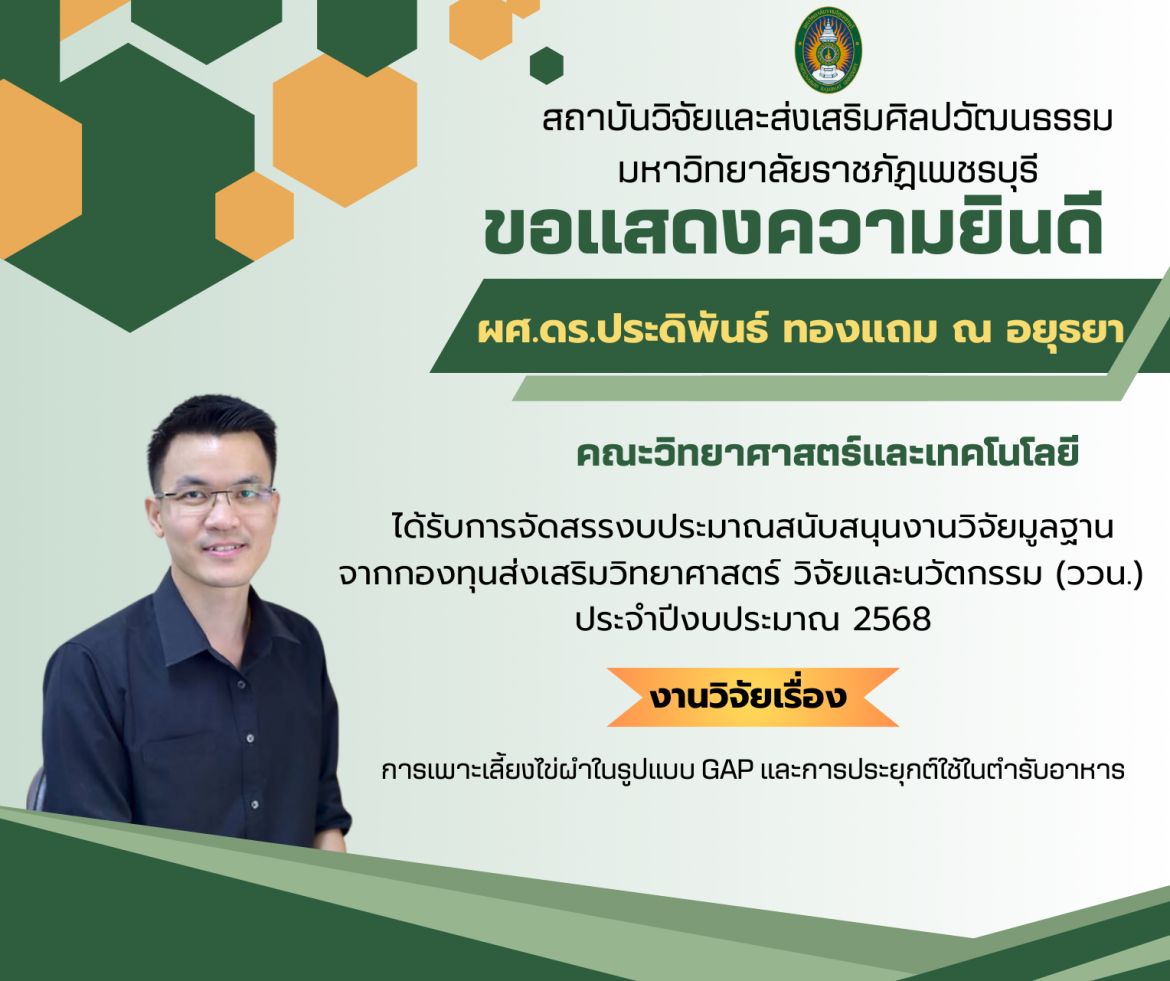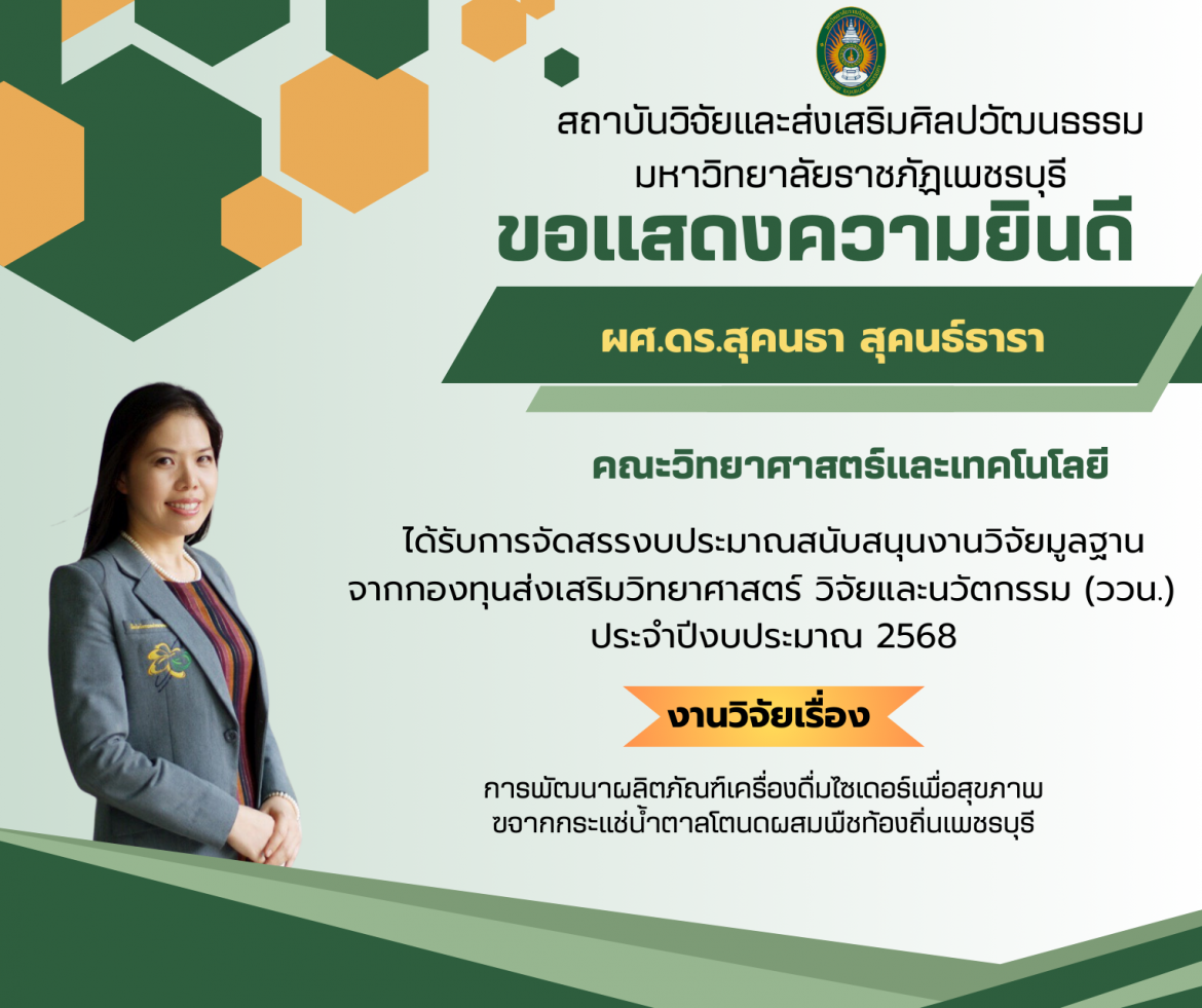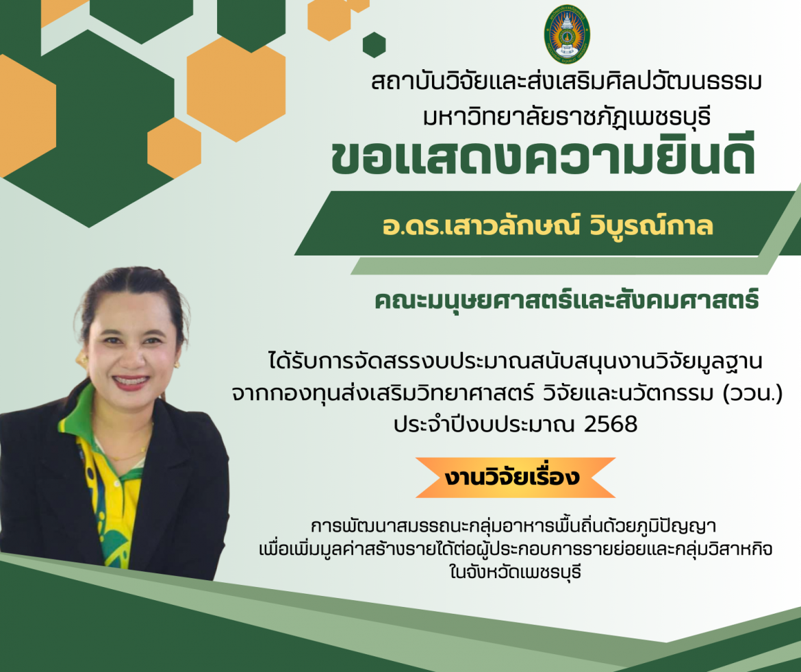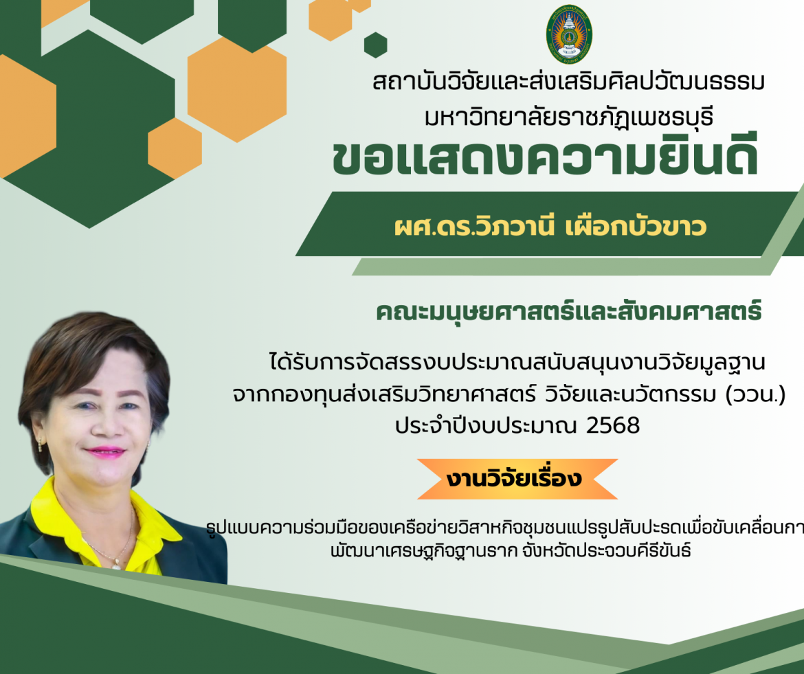 ทั้งนี้ มหาวิทยาลัยราชภัฏเพชรบุรี ได้ส่งเสริมและสนับสนุนให้นักวิจัยที่ได้รับงบประมาณทุนสนับสนุนงานมูลฐานของหน่วยงาน (Fundamental Fund: FF) เข้าร่วมนำเสนอผลการดำเนินงาน จำนวน 4 โครงการ ประกอบด้วย