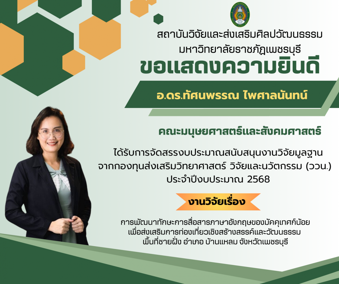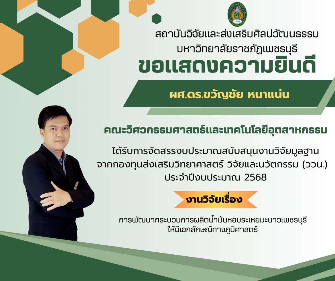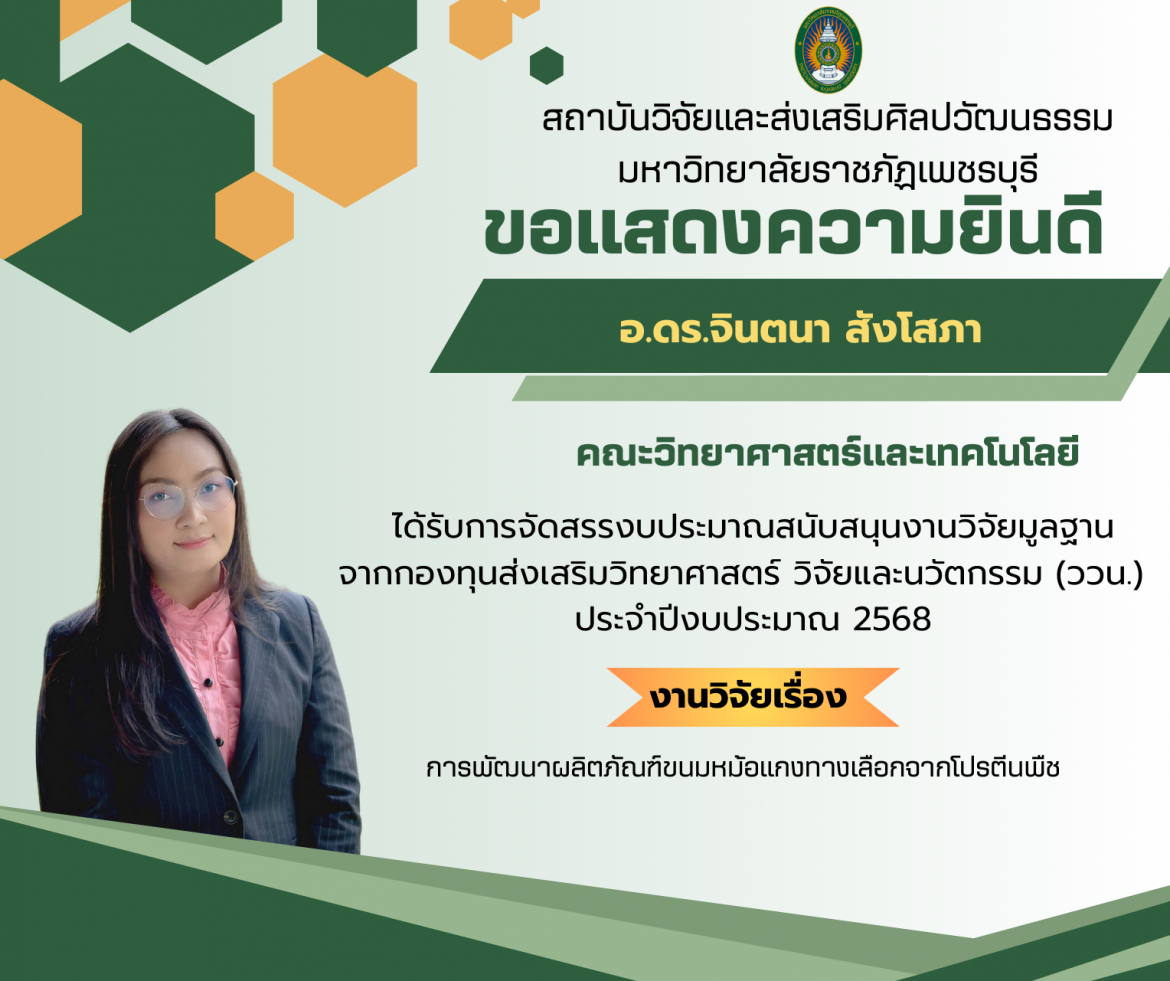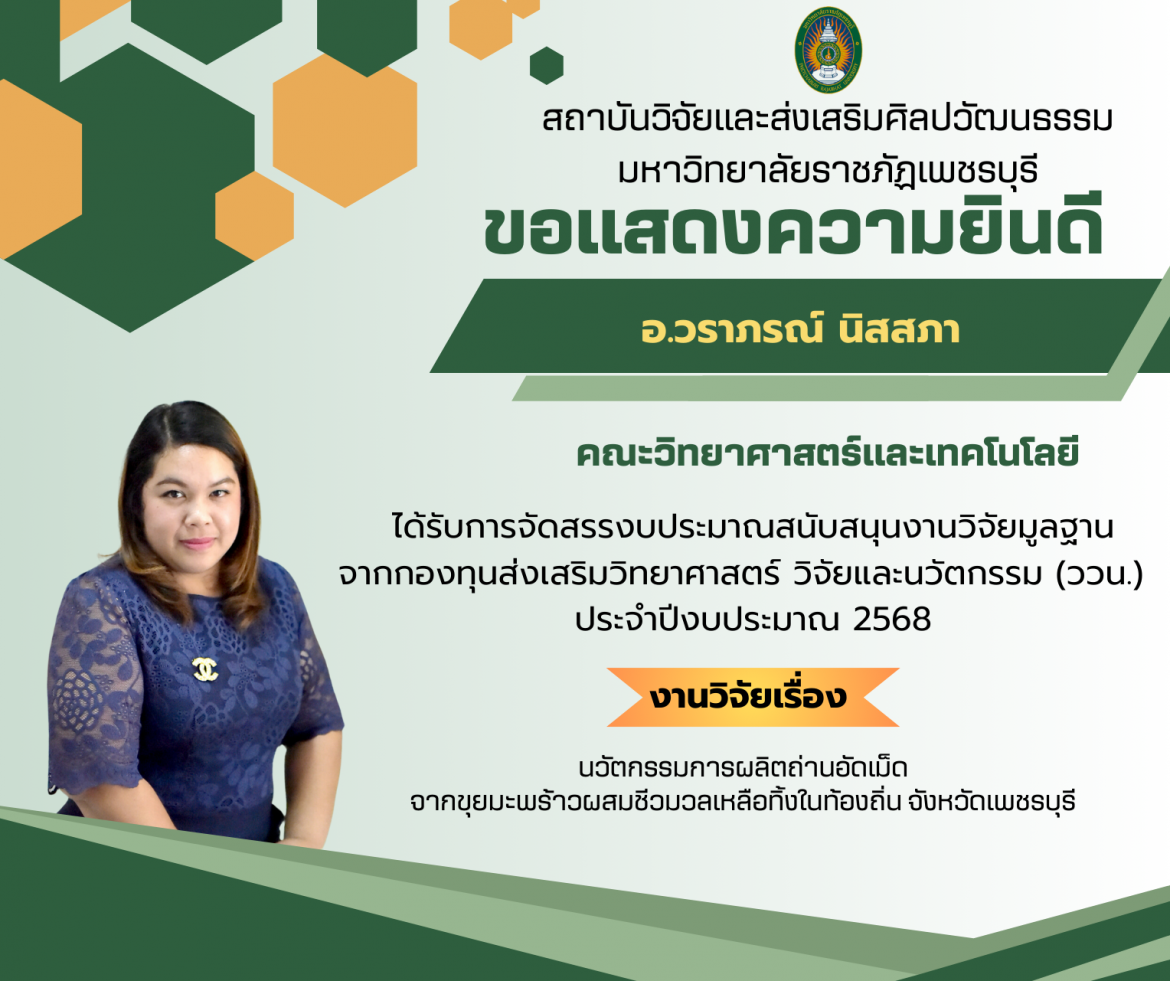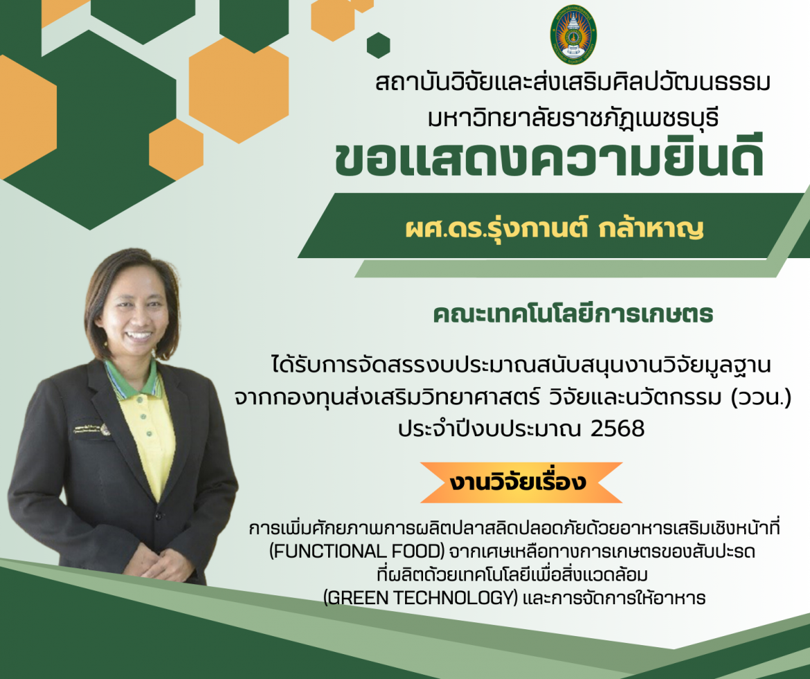 ทั้งนี้ มหาวิทยาลัยราชภัฏเพชรบุรี ได้ส่งเสริมและสนับสนุนให้นักวิจัยที่ได้รับงบประมาณทุนสนับสนุนงานมูลฐานของหน่วยงาน (Fundamental Fund: FF) เข้าร่วมนำเสนอผลการดำเนินงาน จำนวน 4 โครงการ ประกอบด้วย