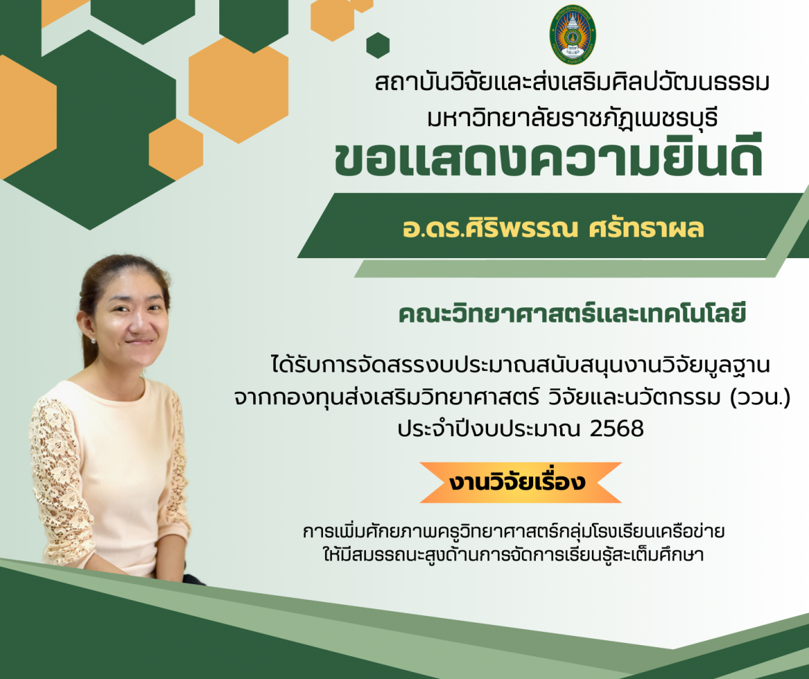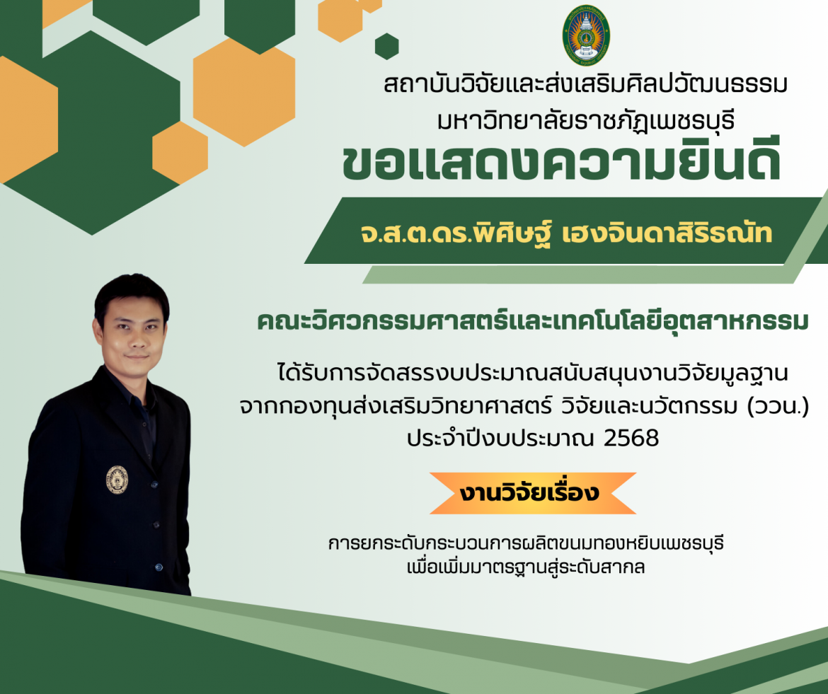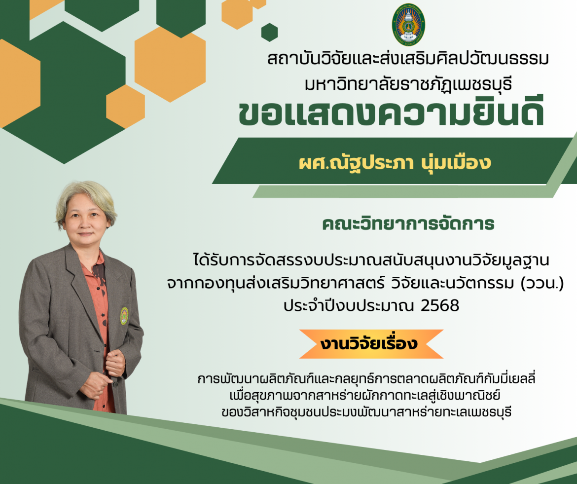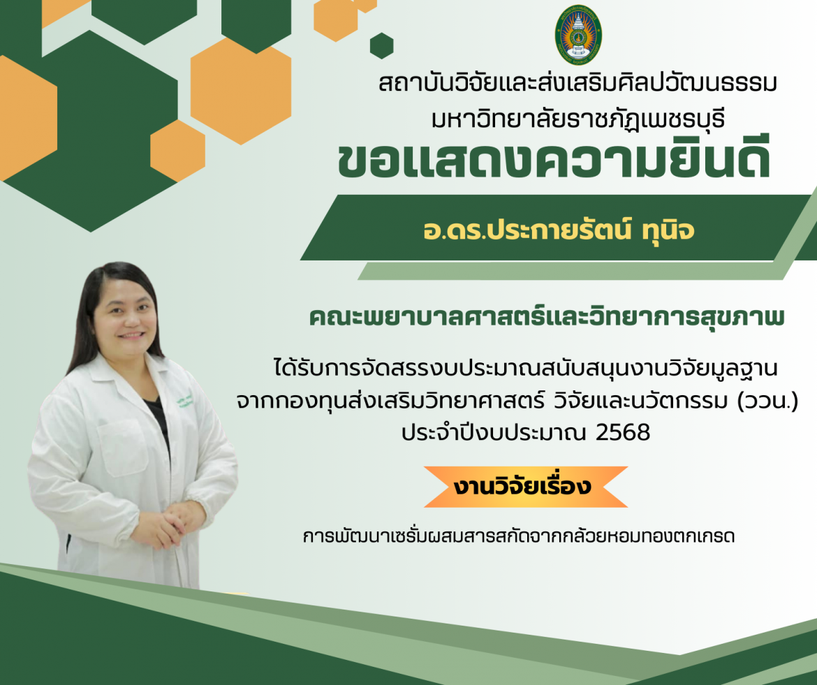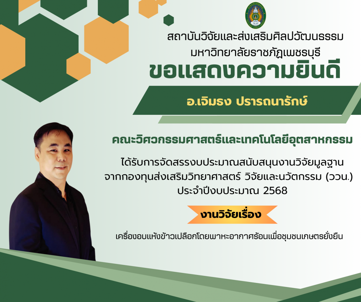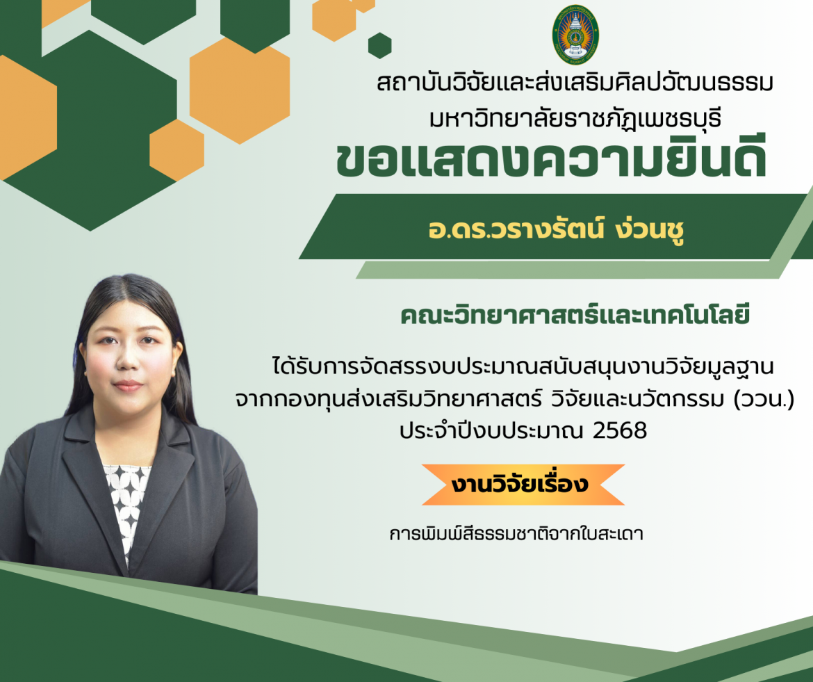 ทั้งนี้ มหาวิทยาลัยราชภัฏเพชรบุรี ได้ส่งเสริมและสนับสนุนให้นักวิจัยที่ได้รับงบประมาณทุนสนับสนุนงานมูลฐานของหน่วยงาน (Fundamental Fund: FF) เข้าร่วมนำเสนอผลการดำเนินงาน จำนวน 4 โครงการ ประกอบด้วย