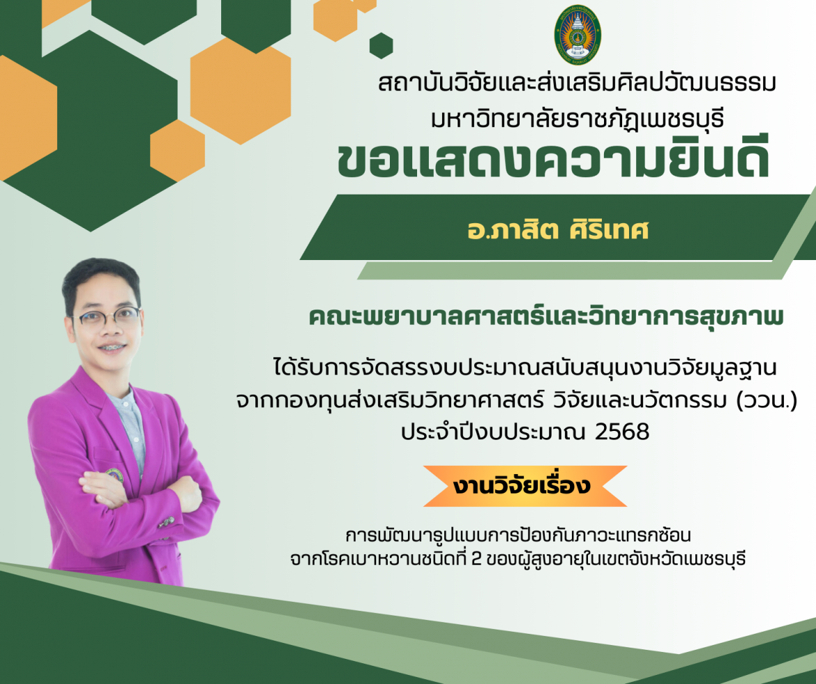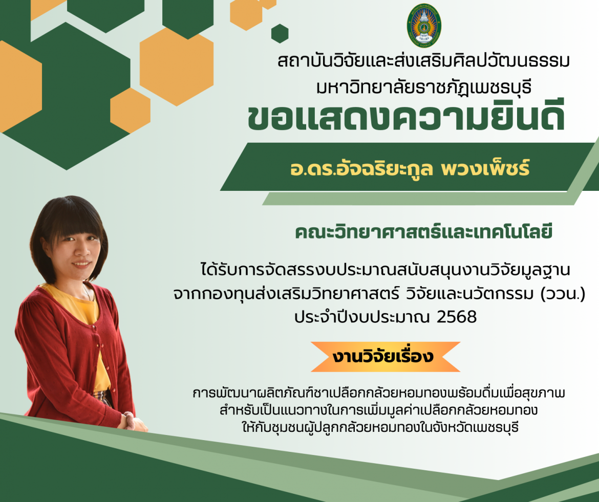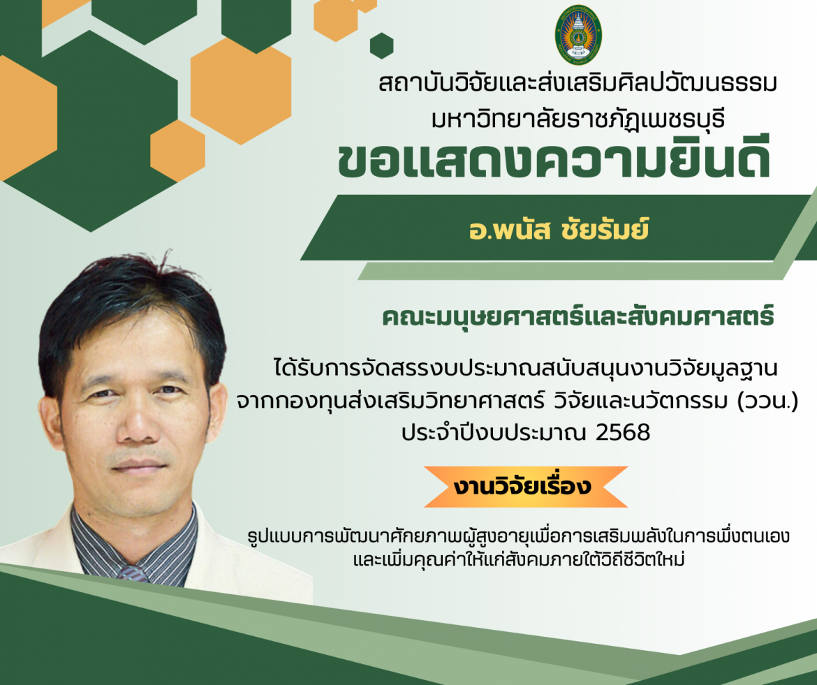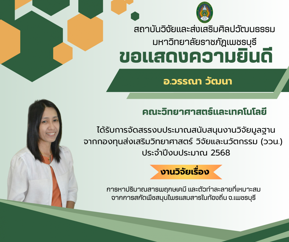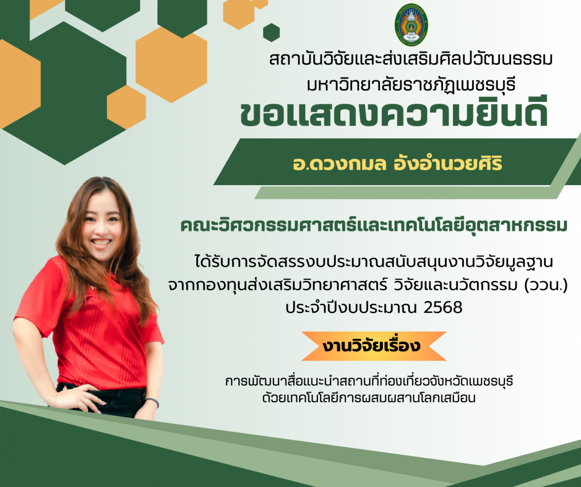 ทั้งนี้ มหาวิทยาลัยราชภัฏเพชรบุรี ได้ส่งเสริมและสนับสนุนให้นักวิจัยที่ได้รับงบประมาณทุนสนับสนุนงานมูลฐานของหน่วยงาน (Fundamental Fund: FF) เข้าร่วมนำเสนอผลการดำเนินงาน จำนวน 4 โครงการ ประกอบด้วย