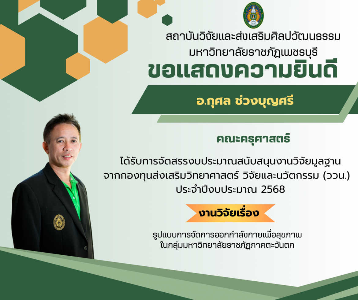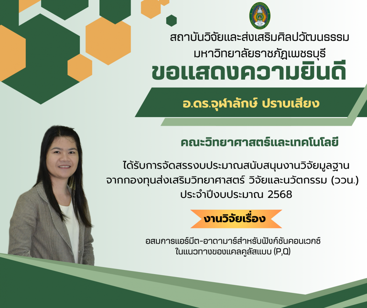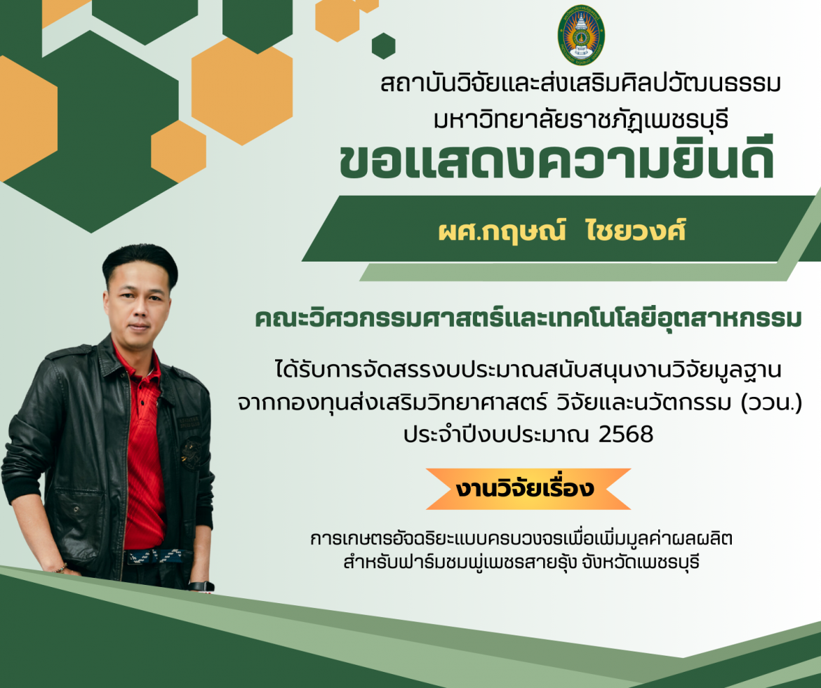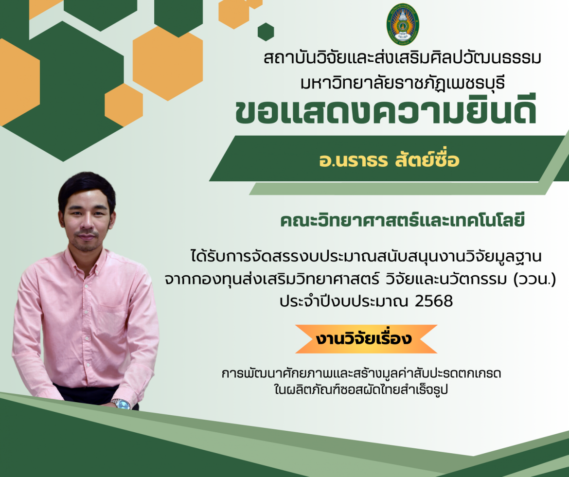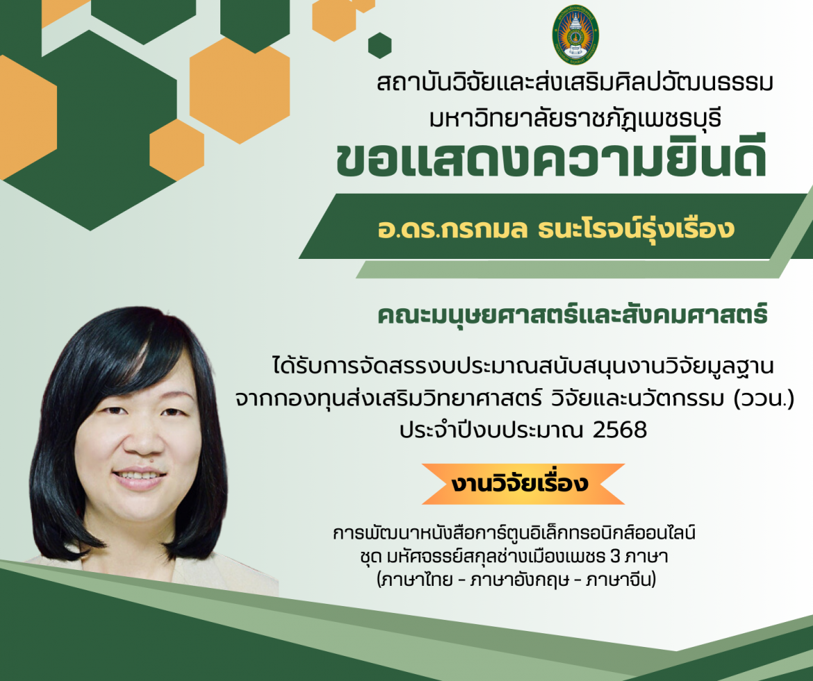 ทั้งนี้ มหาวิทยาลัยราชภัฏเพชรบุรี ได้ส่งเสริมและสนับสนุนให้นักวิจัยที่ได้รับงบประมาณทุนสนับสนุนงานมูลฐานของหน่วยงาน (Fundamental Fund: FF) เข้าร่วมนำเสนอผลการดำเนินงาน จำนวน 4 โครงการ ประกอบด้วย
