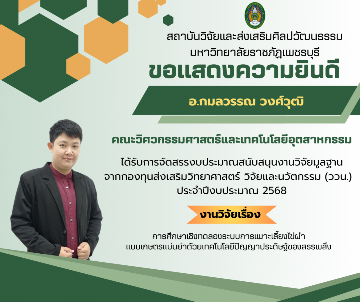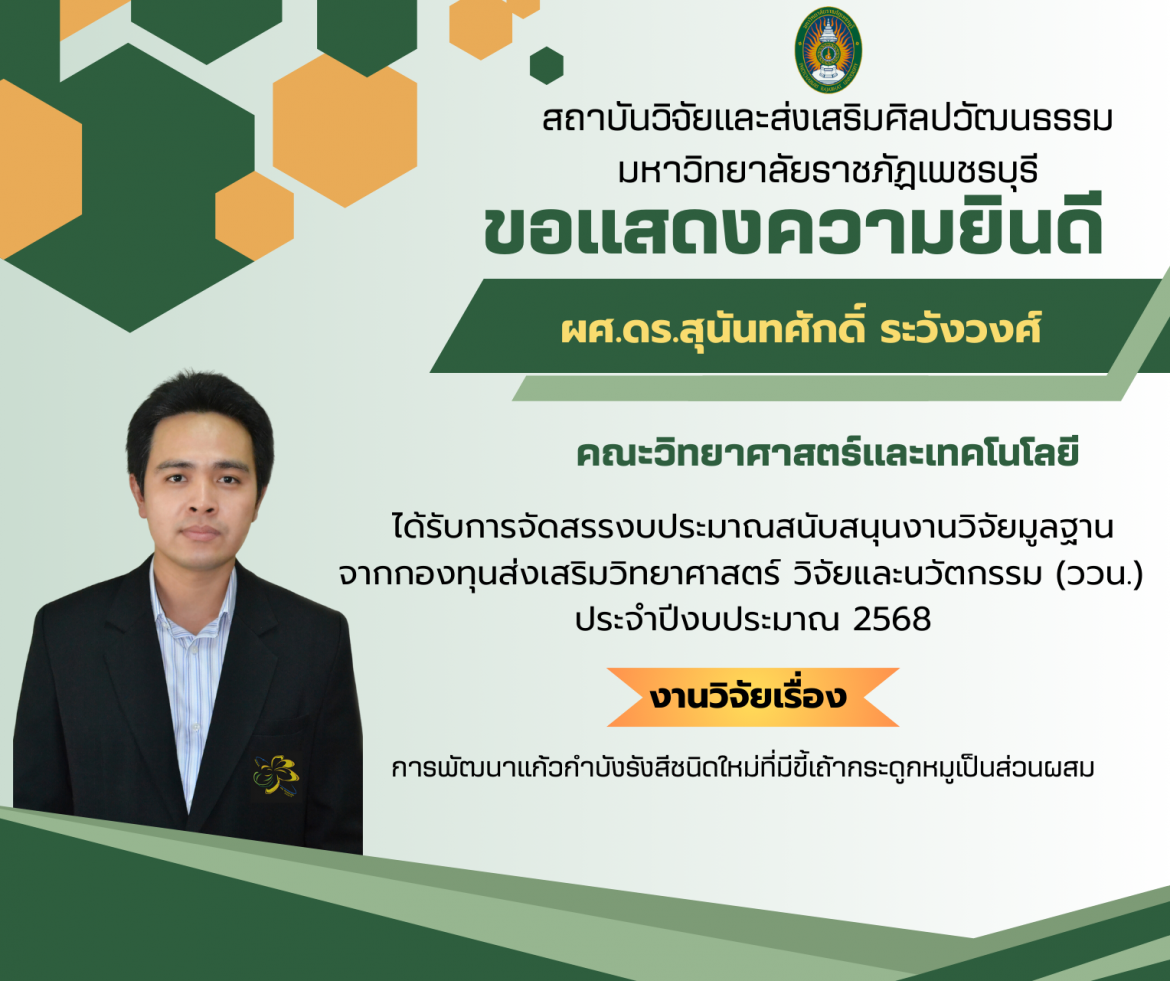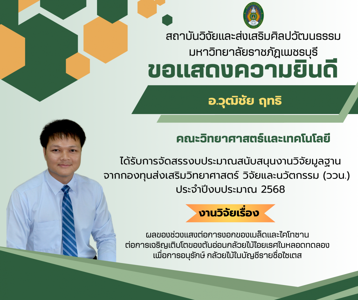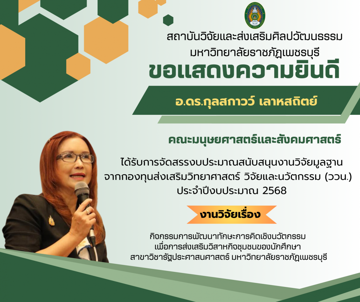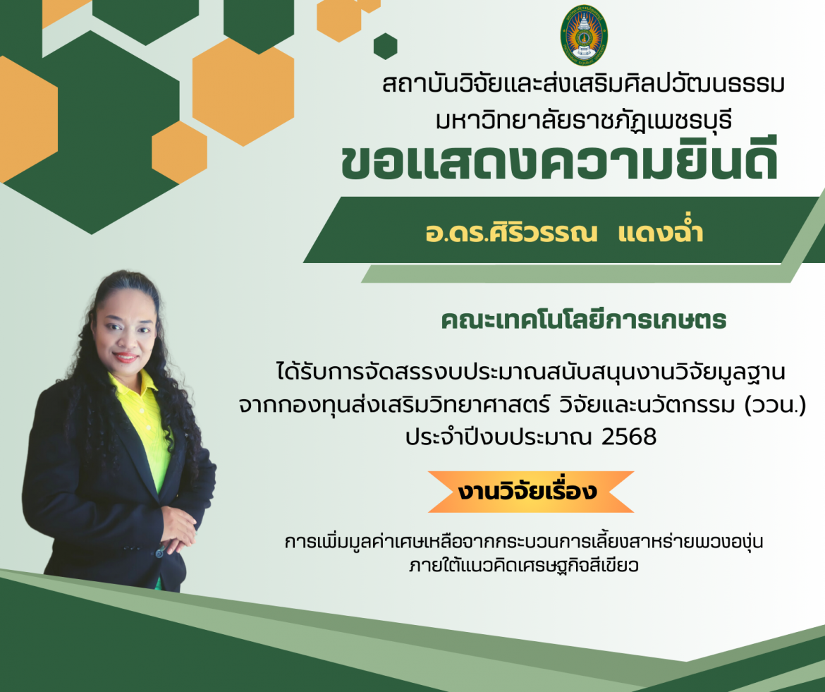 ทั้งนี้ มหาวิทยาลัยราชภัฏเพชรบุรี ได้ส่งเสริมและสนับสนุนให้นักวิจัยที่ได้รับงบประมาณทุนสนับสนุนงานมูลฐานของหน่วยงาน (Fundamental Fund: FF) เข้าร่วมนำเสนอผลการดำเนินงาน จำนวน 4 โครงการ ประกอบด้วย