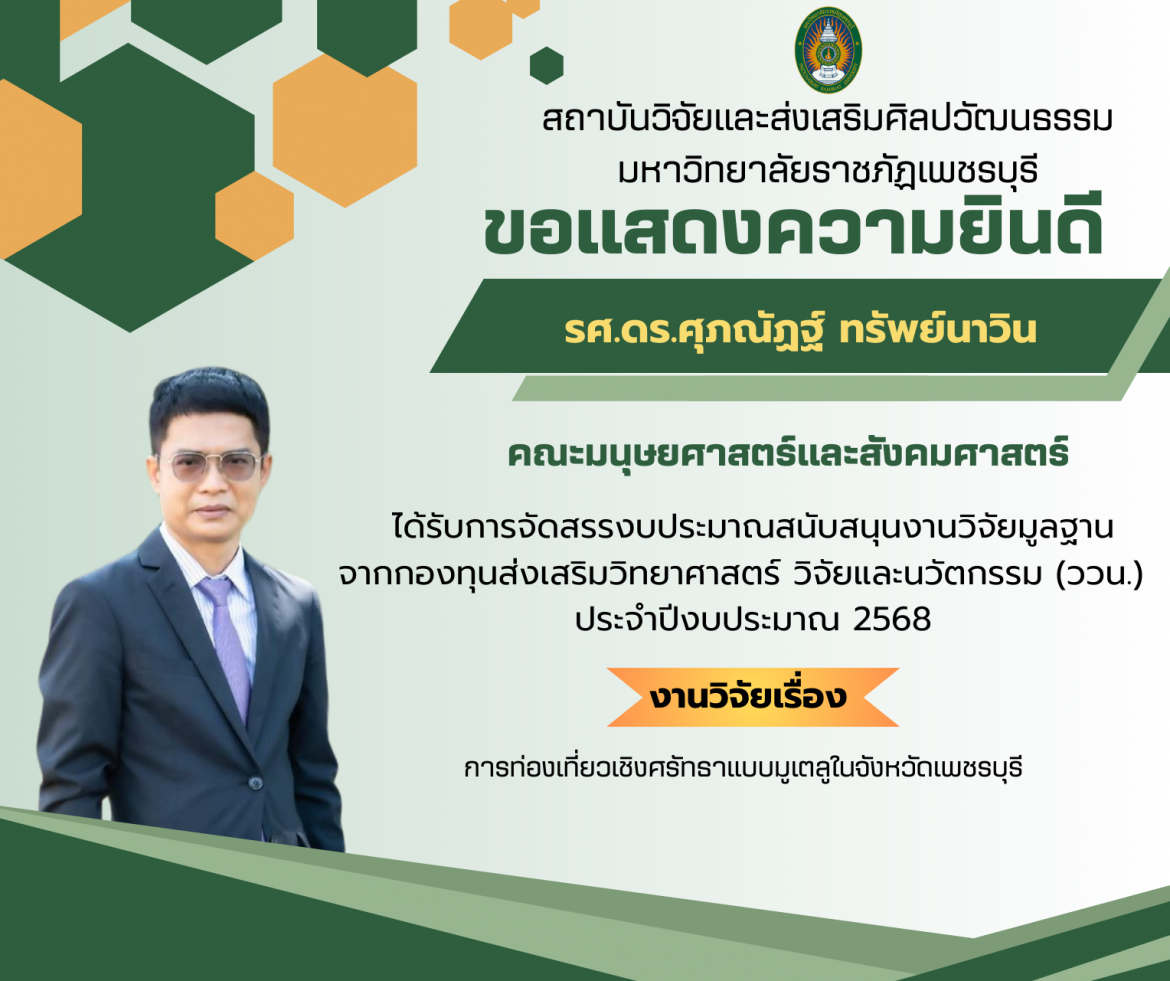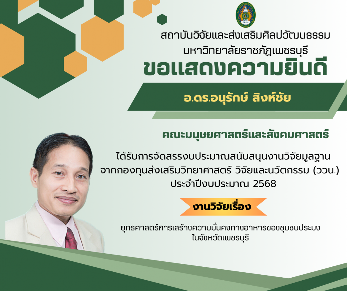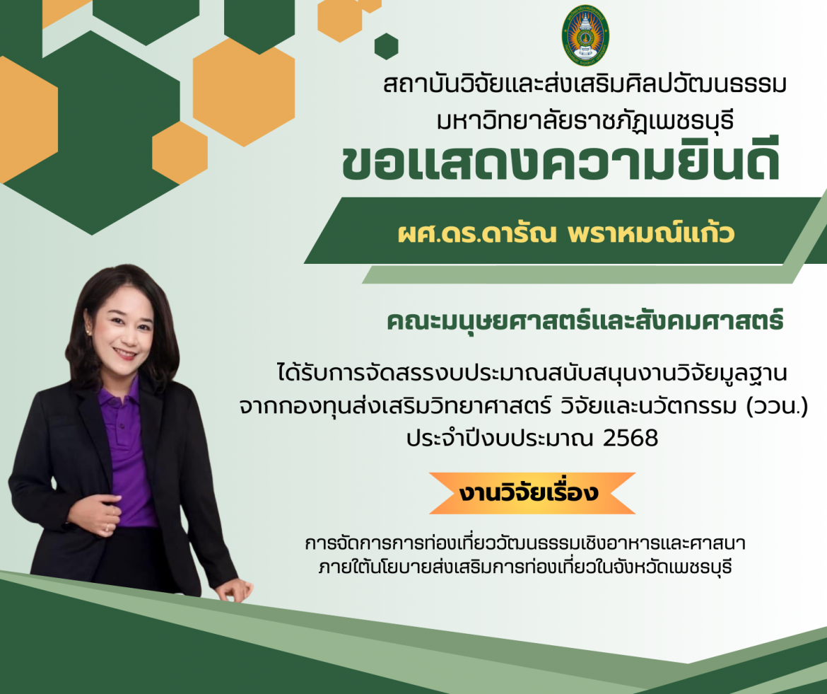 สถาบันวิจัยและส่งเสริมศิลปวัฒนธรรม มหาวิทยาลัยราชภัฏเพชรบุรี นำโดย ผู้ช่วยศาสตราจารย์ ดร.ดำรงศักดิ์ อาลัย รองผู้อำนวยการสถาบันวิจัยและส่งเสริมศิลปวัฒนธรรม พร้อมนักวิจัย และบุคลากรฝ่ายงานวิจัยและพัฒนานวัตกรรม เข้าร่วมการประชุมเครือข่ายบุคลากรด้านวิทยาศาสตร์วิจัยและนวัตกรรม ประจำปี พ.ศ. 2567 ณ โรงแรม เดอะ รีเจ้นท์ ชะอำ บีช รีสอร์ท จังหวัดเพชรบุรี โดยมี สำนักงานคณะกรรมการส่งเสริมวิทยาศาสตร์ วิจัยและนวัตกรรม (สกสว.) เป็นเจ้าภาพจัดงาน และได้รับเกียรติจาก นางสาวศุภมาส อิศรภักดี รัฐมนตรีว่าการกระทรวงการอุดมศึกษา วิทยาศาสตร์ วิจัยและนวัตกรรม (อว.) เป็นประธานในพิธีเปิดงาน ซึ่งการจัดงานประชุมในครั้งนี้ มีวัตถุประสงค์เพื่อจุดประกายนักวิจัยรุ่นใหม่สู่เครือข่ายความร่วมมืออนาคตชาติ และขับเคลื่อนอนาคตไทยด้วย ววน. ปลอดล็อกศักยภาพ เร่งผลิตพัฒนากำลังคน รองรับการลงทุนใหม่เพื่อยกระดับประเทศสู่เส้นทางอาชีพเพื่อนักวิจัยในการสร้างโอกาสกับการสนับสนุนของกองทุนส่งเสริม ววน.
