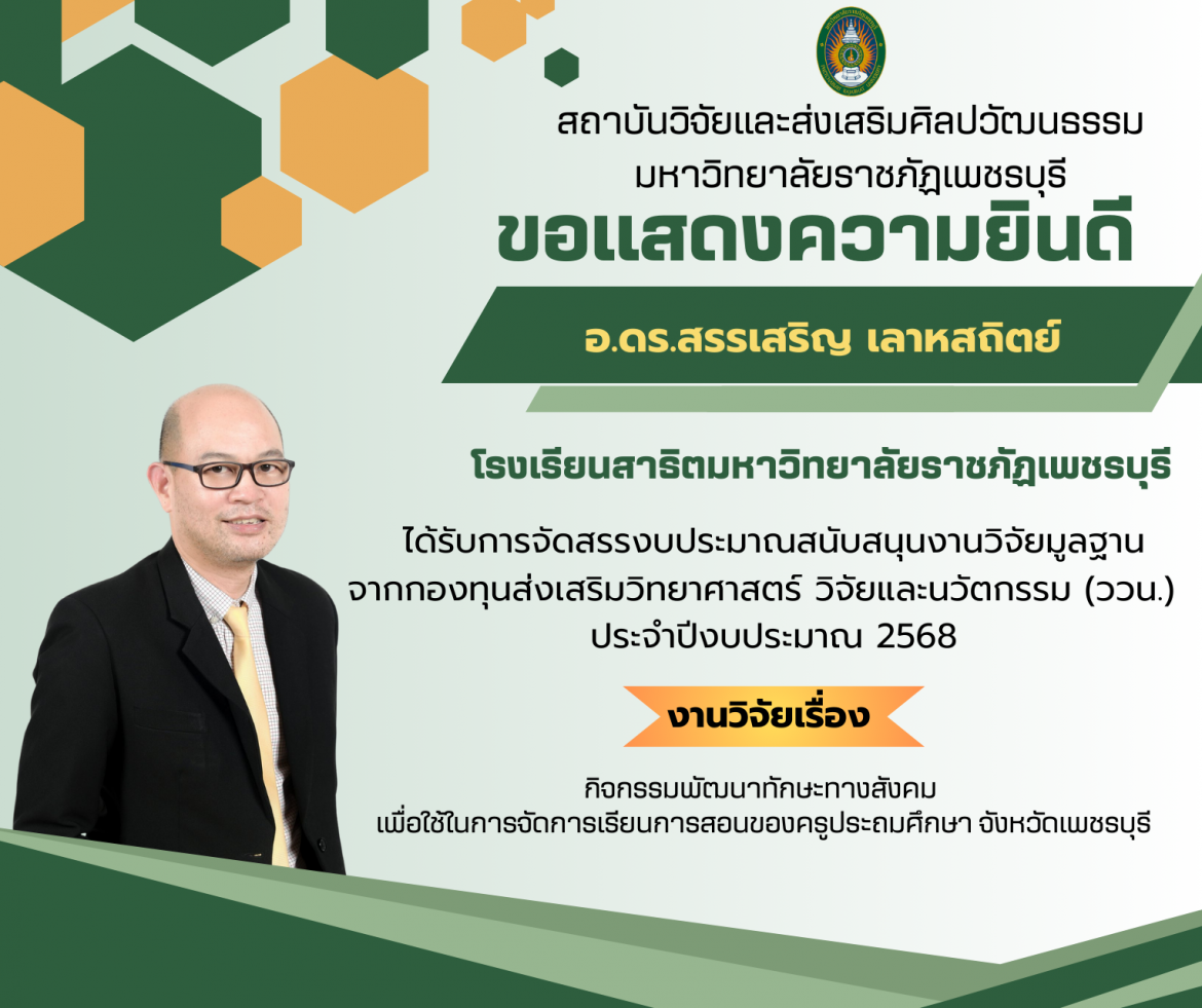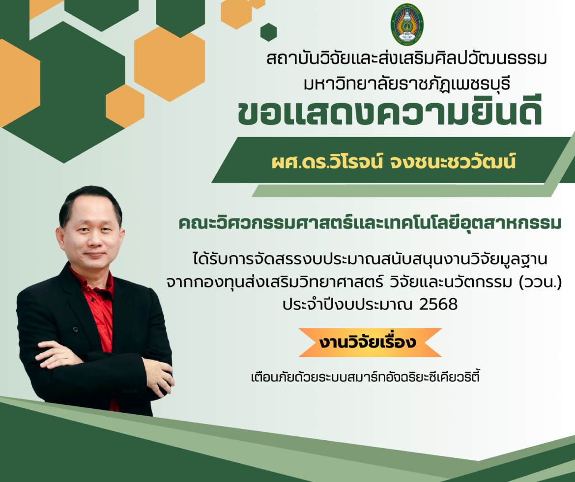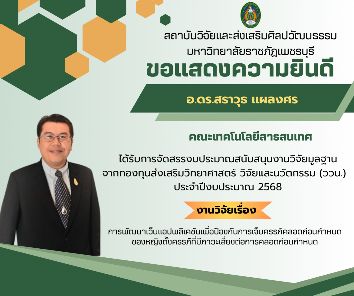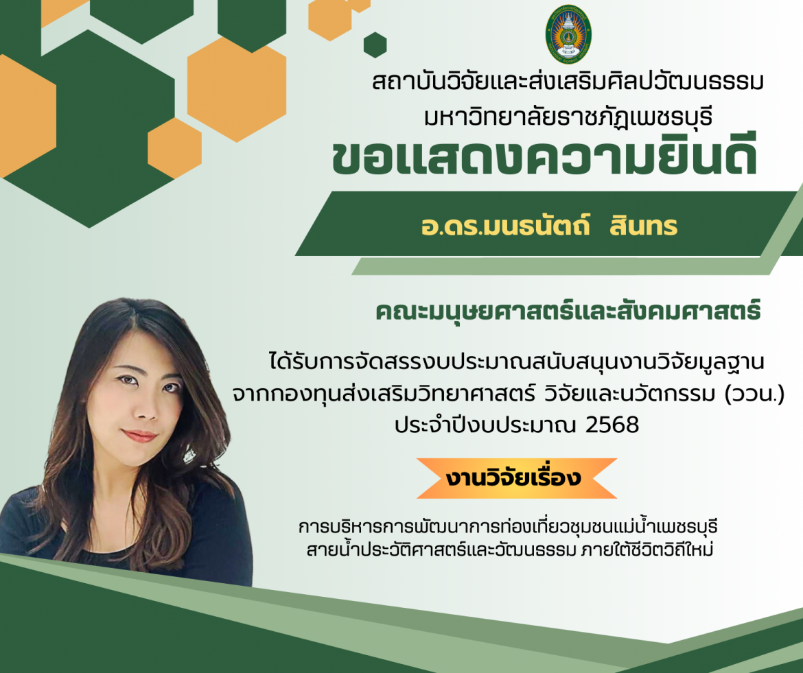 สถาบันวิจัยและส่งเสริมศิลปวัฒนธรรม มหาวิทยาลัยราชภัฏเพชรบุรี นำโดย ผู้ช่วยศาสตราจารย์ ดร.ดำรงศักดิ์ อาลัย รองผู้อำนวยการสถาบันวิจัยและส่งเสริมศิลปวัฒนธรรม พร้อมนักวิจัย และบุคลากรฝ่ายงานวิจัยและพัฒนานวัตกรรม เข้าร่วมการประชุมเครือข่ายบุคลากรด้านวิทยาศาสตร์วิจัยและนวัตกรรม ประจำปี พ.ศ. 2567 ณ โรงแรม เดอะ รีเจ้นท์ ชะอำ บีช รีสอร์ท จังหวัดเพชรบุรี โดยมี สำนักงานคณะกรรมการส่งเสริมวิทยาศาสตร์ วิจัยและนวัตกรรม (สกสว.) เป็นเจ้าภาพจัดงาน และได้รับเกียรติจาก นางสาวศุภมาส อิศรภักดี รัฐมนตรีว่าการกระทรวงการอุดมศึกษา วิทยาศาสตร์ วิจัยและนวัตกรรม (อว.) เป็นประธานในพิธีเปิดงาน ซึ่งการจัดงานประชุมในครั้งนี้ มีวัตถุประสงค์เพื่อจุดประกายนักวิจัยรุ่นใหม่สู่เครือข่ายความร่วมมืออนาคตชาติ และขับเคลื่อนอนาคตไทยด้วย ววน. ปลอดล็อกศักยภาพ เร่งผลิตพัฒนากำลังคน รองรับการลงทุนใหม่เพื่อยกระดับประเทศสู่เส้นทางอาชีพเพื่อนักวิจัยในการสร้างโอกาสกับการสนับสนุนของกองทุนส่งเสริม ววน.