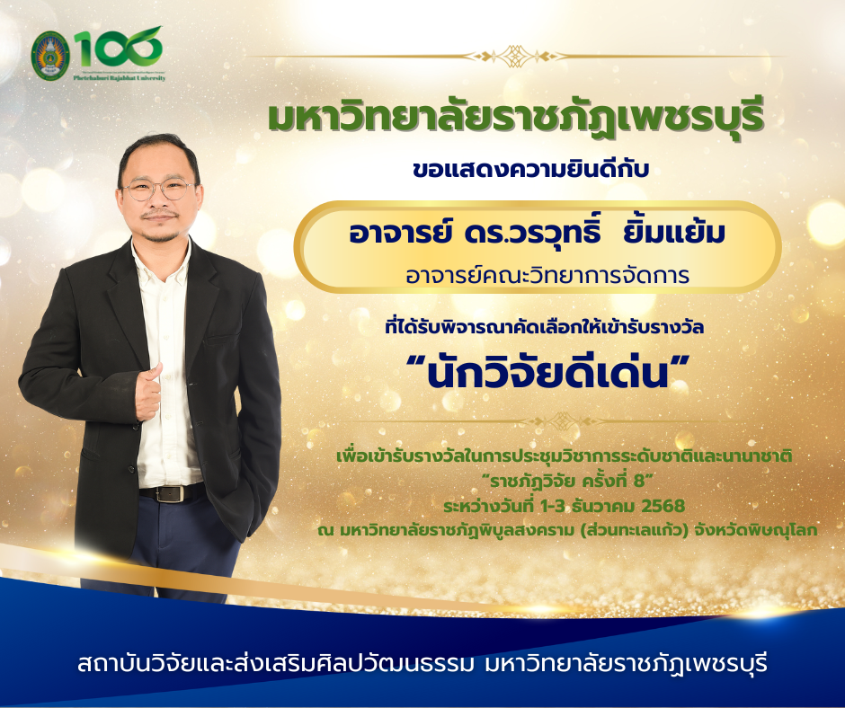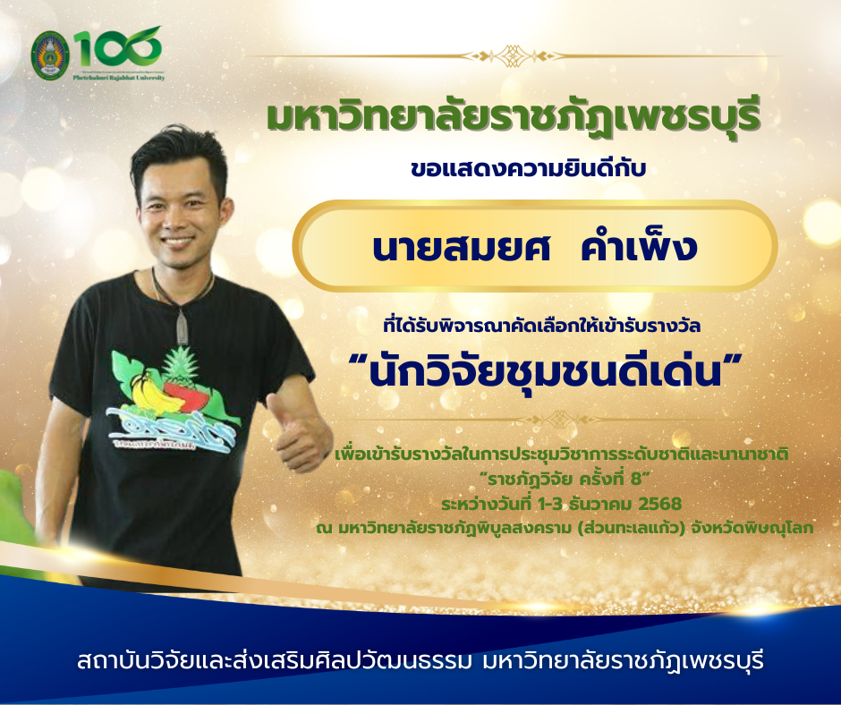 สถาบันวิจัยและส่งเสริมศิลปวัฒนธรรม มหาวิทยาลัยราชภัฏเพชรบุรี โดย นางสาววณิชยา ทองสมนึก ตำแหน่งนักวิชาการศึกษา ปฏิบัติการ สังกัดงานพัฒนาท้องถิ่นและบริการวิชาการ ได้นำเสนอผลงานเรื่อง “รูปแบบการดำเนินงานพันธกิจสัมพันธ์มหาวิทยาลัยราชภัฏเพชรบุรีรับใช้สังคมมุ่งสู่เป้าหมายการพัฒนาที่ยั่งยืน” ในเวที โครงการจัดการความรู้และแนวปฏิบัติที่ดี ระดับชาติ ครั้งที่ 1 ซึ่งจัดขึ้นโดยมีมหาวิทยาลัยราชภัฏสุรินทร์เป็นเจ้าภาพ