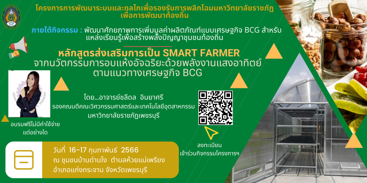 ภายใต้กิจกรรม : พัฒนาศักยภาพในการเป็นแหล่งเรียนรู้ แหล่งเสริมพลังปัญญาของชุมชนท้องถิ่น รายกิจกรรม : พัฒนาศักยภาพการเพิ่มมูลค่าผลิตภัณฑ์แบบเศรษฐกิจ BCG สำหรับแหล่งเรียนรู้เพื่อสร้างพลังปัญญาของชุมชนท้องถิ่น จัดกิจกรรมอบรมเชิงปฏิบัติการ หลักสูตรส่งเสริมการเป็น SMART farmer จากนวัตกรรมการอบแห้งอัจฉริยะด้วยพลังงานแสงอาทิตย์ตามแนวทางเศรษฐกิจ BCG ในภาคบรรยาย และภาคปฏิบัติ (Workshop)