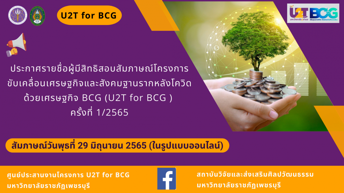 มหาวิทยาลัยราชภัฏเพชรบุรี ประกาศรายชื่อผู้มีสิทธิ์เข้ารับการสอบสัมภาษณ์เพื่อคัดเลือกเป็นผู้เข้าร่วมโครงการขับเคลื่อนเศรษฐกิจและสังคมฐานรากหลังโควิคด้วยเศรษฐกิจ BCG (U2T for BCG) จำนวน 24 ตำบล รายชื่อตามเอกสารแนบ