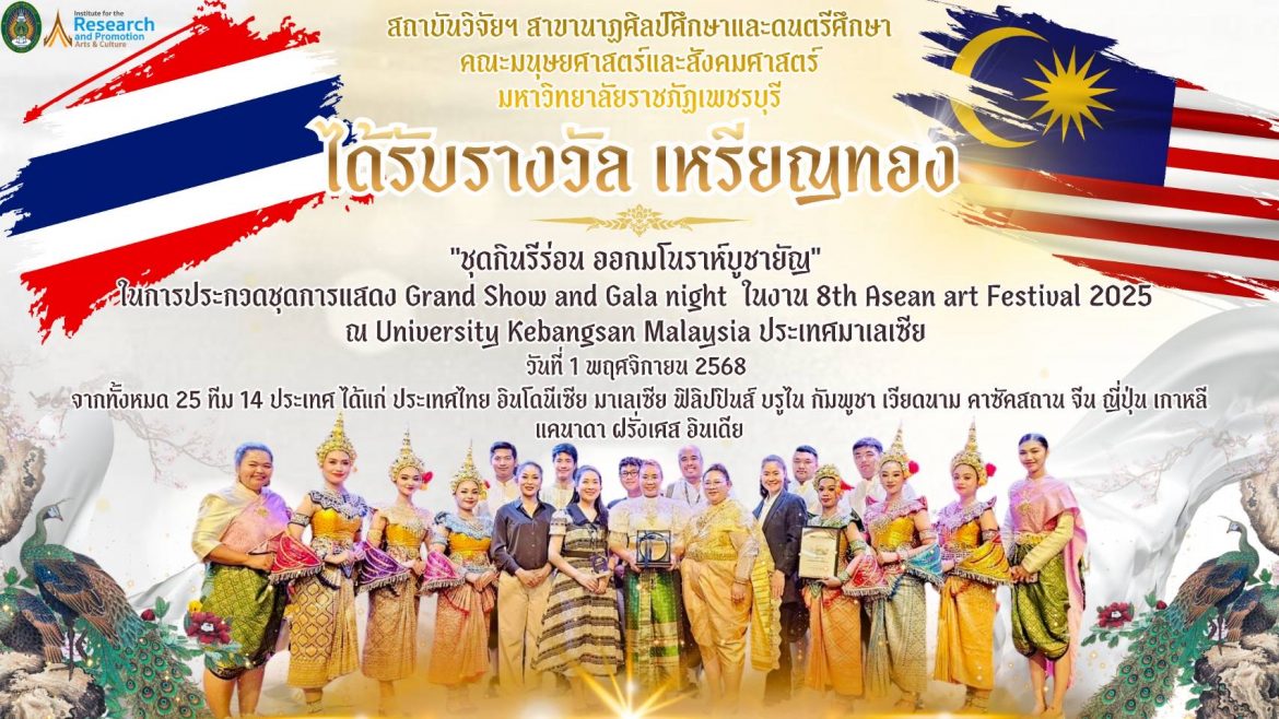 💚💛นำชุดการแสดงชุด “กินรีร่อนออกมโนราห์บูชายัญ” เข้าร่วมในการแข่งขัน 8th Asean Art Festival ณ มหาวิทยาลัยแห่งชาติมาเลเซีย สหพันธรัฐมาเลเซีย โดยในปีนี้ได้มีผู้เข้าร่วมการแสดงทั้งหมด 25 สถาบันอุดมศึกษา จากทั้งสิ้น 14 ประเทศ ได้แก่ ประเทศไทย อินโดนีเซีย มาเลเซีย ฟิลิปปินส์ บรูไน กัมพูชา เวียดนาม คาซัคสถาน จีน ญี่ปุ่น เกาหลี แคนาดา ฝรั่งเศส อินเดีย โดยในดังกล่าวได้มีการแข่งขันการประกวดชุดการแสดงยอดเยี่ยม แบ่งเป็น 3 รางวัล ได้แก่ เหรียญทอง เหรียญเงิน และเหรียญทองแดง มหาวิทยาลัยราชภัฏเพชรบุรีทำสำเร็จด้วยการนำชุดการแสดง “กินรีร่อนออกมโนราห์บูชายัญ” ได้เหรียญทองได้สำเร็จเป็นครั้งแรก! การแสดงดังกล่าวเป็นการร่ายรำในชุดกินรีร่อนออกบูชายัญ โดยทำนองดนตรีสดบรรเลง สร้างรความตื่นตาตื่นใจและความสนใจให้กับคนดูจำนวนมาก ซึ่งชุดการแสดงดังกล่าวสาขาดนตรีไทยและนาฏศิลป์ศึกษา ตั้งใจและพากเพียรและการฝึกซ้อมในการเตรียมตัวเป็นเวลานับหลายเดือน