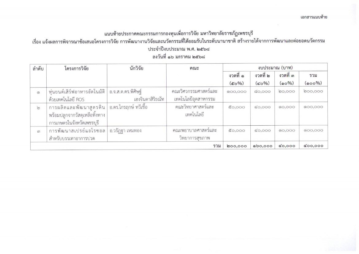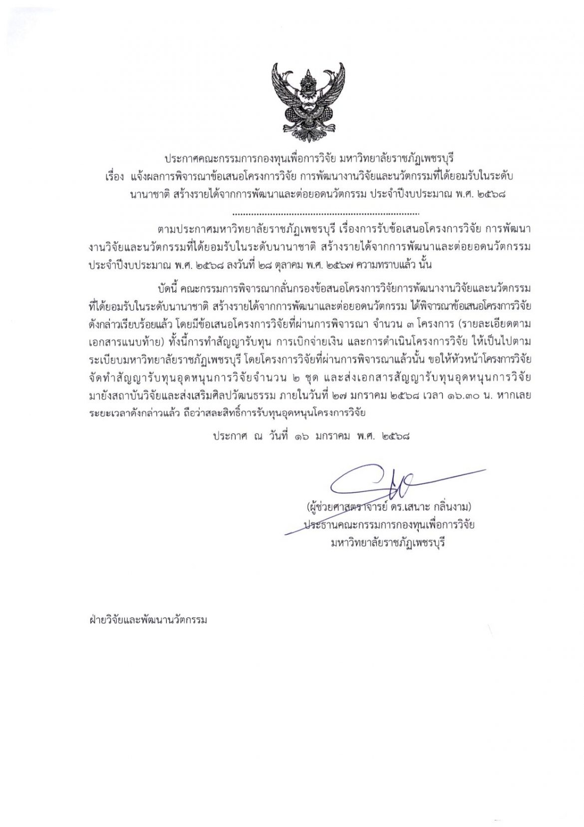 สถาบันวิจัยและส่งเสริมศิลปวัฒนธรรม ขอแจ้งผลการพิจารณาข้อเสนอโครงการวิจัย การพัฒนางานวิจัยและนวัตกรรมที่ได้ยอมรับในระดับ นานาชาติ สร้างรายได้จากการพัฒนาและต่อยอดนวัตกรรม ประจำปีงบประมาณ พ.ศ. 2568