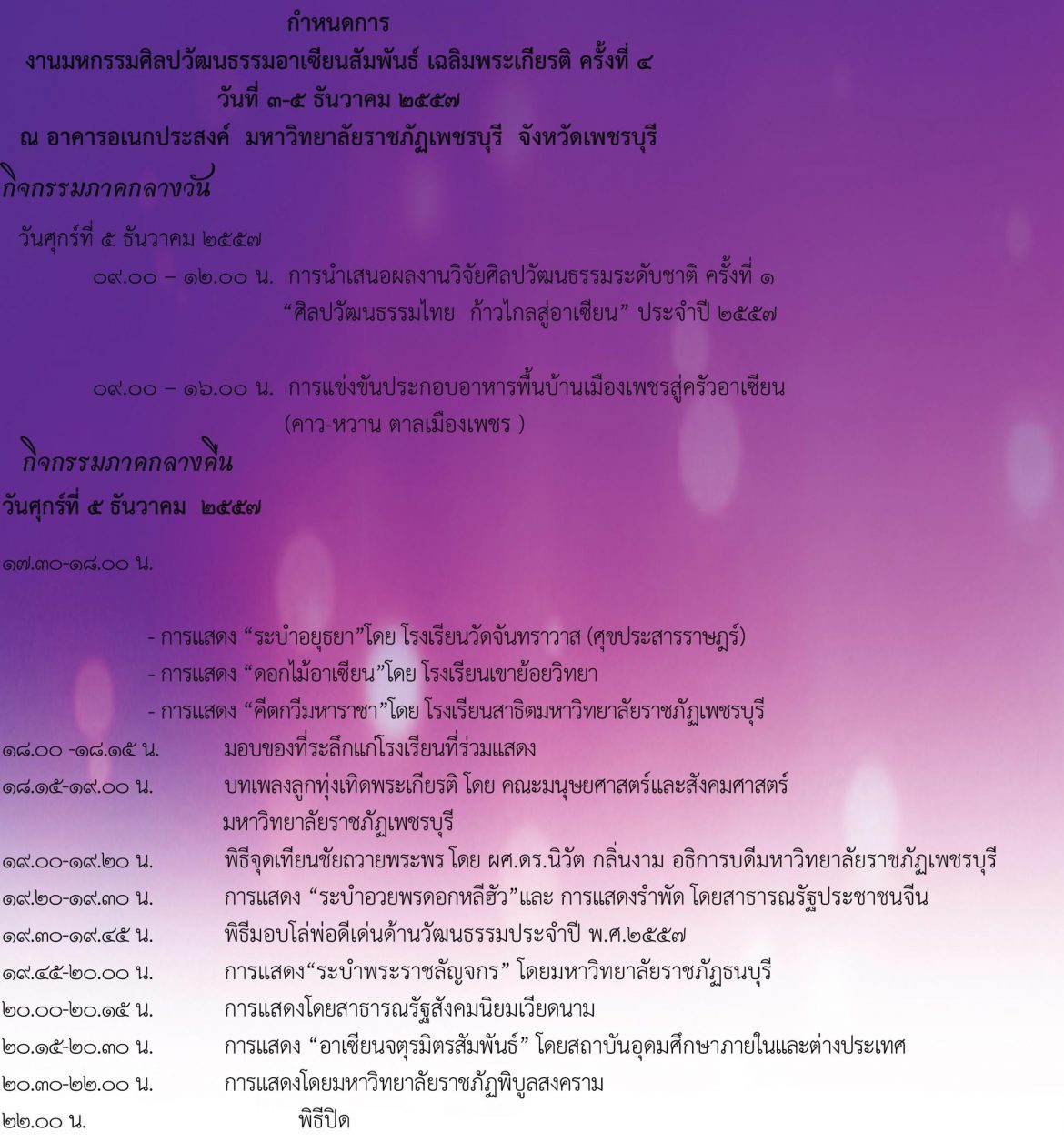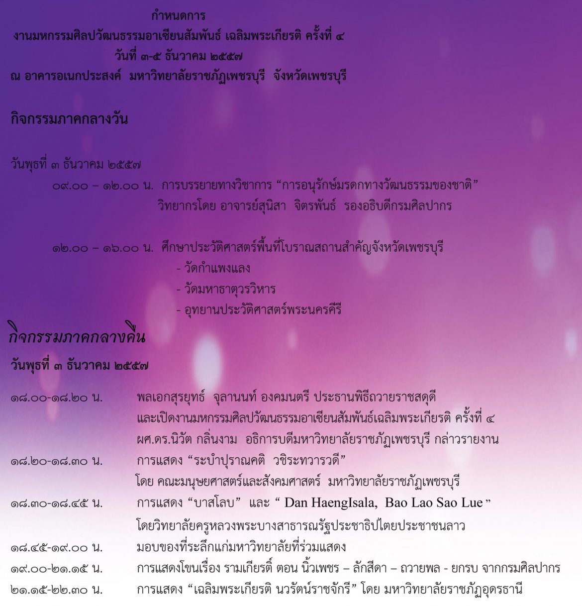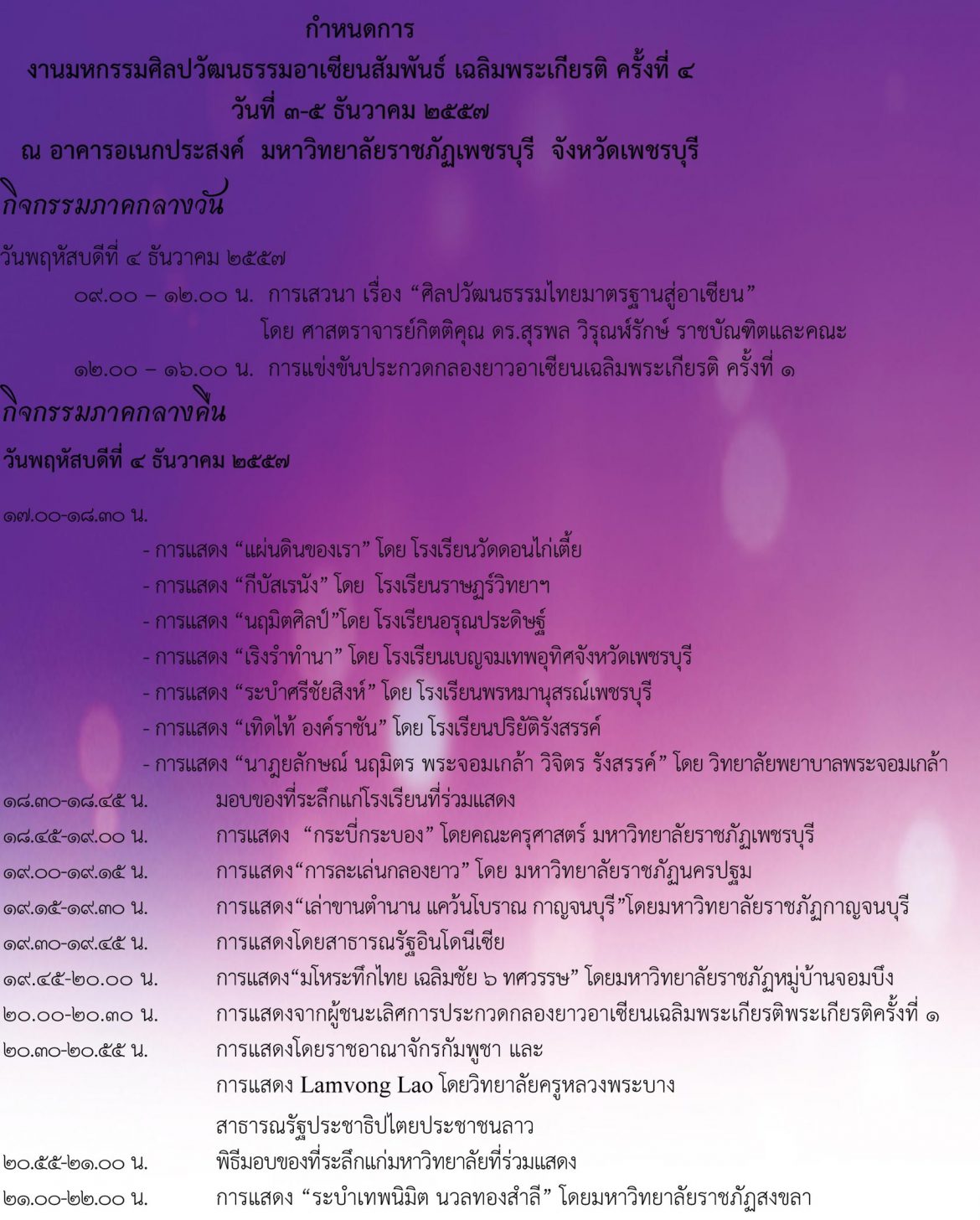มหาวิทยาลัยราชภัฏเพชรบุรี ได้รับเกียรติจากพลอากาศเอกชลิต พุกผาสุข องคมนตรีและนายกสภามหาวิทยาลัยเป็นประธานในพิธีเปิดงานมหกรรมศิลปวัฒนธรรมอาเซี่ยนสัมพันธ์และการแสดงนานาชาติครั้งที่ 13 ณ อุทยานเฉลิมพระเกียรติ พระบาทสมเด็จพระเจ้าอยู่หัว รัชกาลที่ 4 โดยมีนักแสดงจาก 10 มหาวิทยาลัยในประเทศ นักแสดงจาก 13 ประเทศ 3 ทวีป ได้แก่ ทวีปเอเชีย ทวีปยุโรป และทวีปอเมริกาใต้ และจากมหาวิทยาลัยชั้นนำ 15 มหาวิทยาลัย และโรงเรียนในจังวัดเพชรบุรีและจังหวัดประจวบคีรีขันธ์ จำนวน 22 โรงเรียน เข้าร่วมในการแสดงกิจกรรมตลอด 4 วัน ซึ่งได้รับความสนใจจากนักท่องเที่ยวและประชาชนชาวเพชรบุรีเป็นอย่างมาก และในวันสุดท้าย ได้รับเกียรติจาก ท่านรัคมัค บูดีมัน เอกอัครราชทูตสหรัฐอินโดนีเซียประจำประเทศไทย ให้เกียรติร่วมเยี่ยมชมนิทรรศการและการแสดงบนเวที จนถึงพิธีปิดงานในครั้งนี้