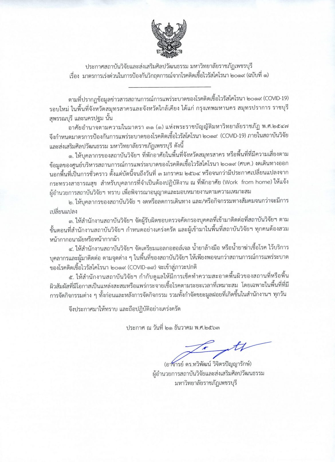 สถาบันวิจัยฯ ประกาศสถาบันวิจัยและส่งเสริมศิลปวัฒนธรรม มหาวิทยาลัยราชภัฏเพชรบุรี เรื่อง มาตรการเร่งด้วนในการป้องกันวิกฤตการณ์จากโรคติดเชื้อไวรัสโคโรนา 2019 (ฉบับที่ 1) by วันณพงค์ 25 ธันวาคม 2020 written by วันณพงค์ 25 ธันวาคม 2020 0 comment 0 FacebookTwitterLINEEmail